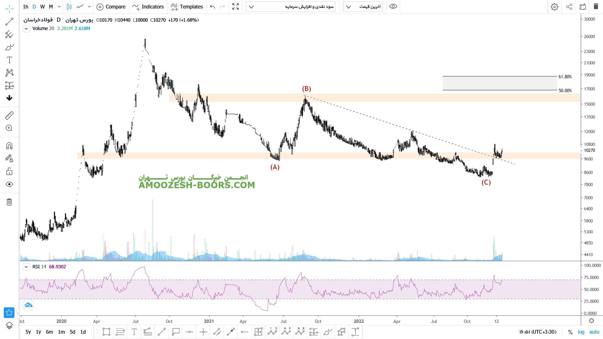 قیمت سهام نماد فخاس را مشاهده می کنید که پس از تشکیل و تکمیل الگوی اصلاحی خود با شکست خط روند نزولی و همچنین قرارگیری بر روی ناحیه حمایتی 1000 تومان مستعد رشد تا ناحیه مقاومتی مهم ۱۶۰۰ تومان در میان مدت می باشد. در این بین مقاومت ناحیه ۱۲۰۰ تومان هم قرار دارد که می تواند اولین مقاومت فخاس باشد.