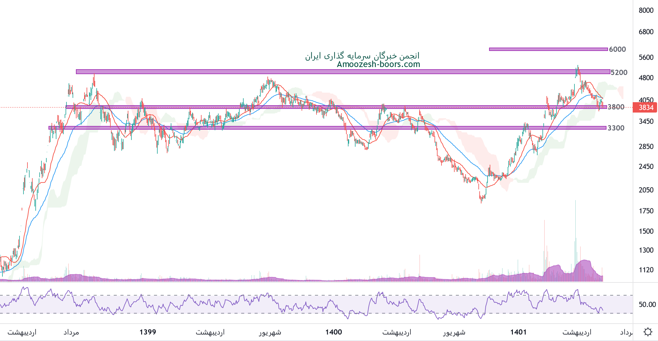 نماد فخوز بعد از ورود به فاز اصلاحی به محدوده حمایت 3800 ریال رسیده و در حال نوسان در این ناحیه میباشد، در صورت تثبیت قیمت و بیس سازی و ایجاد کتدل های مثبت، سهم فخوز میتواند تا محدوده 5200 ریال حرکت داشته باشد، همچنین در صورت ادمه دار شدن اصلاح و از دست رفتن محدوده حمایتی ذکر شده، حمایت بعدی 3300 ریال در نظر گرفته خواهد شد، در صورت تمایل به ورود به حد ضرر پایبند باشید.