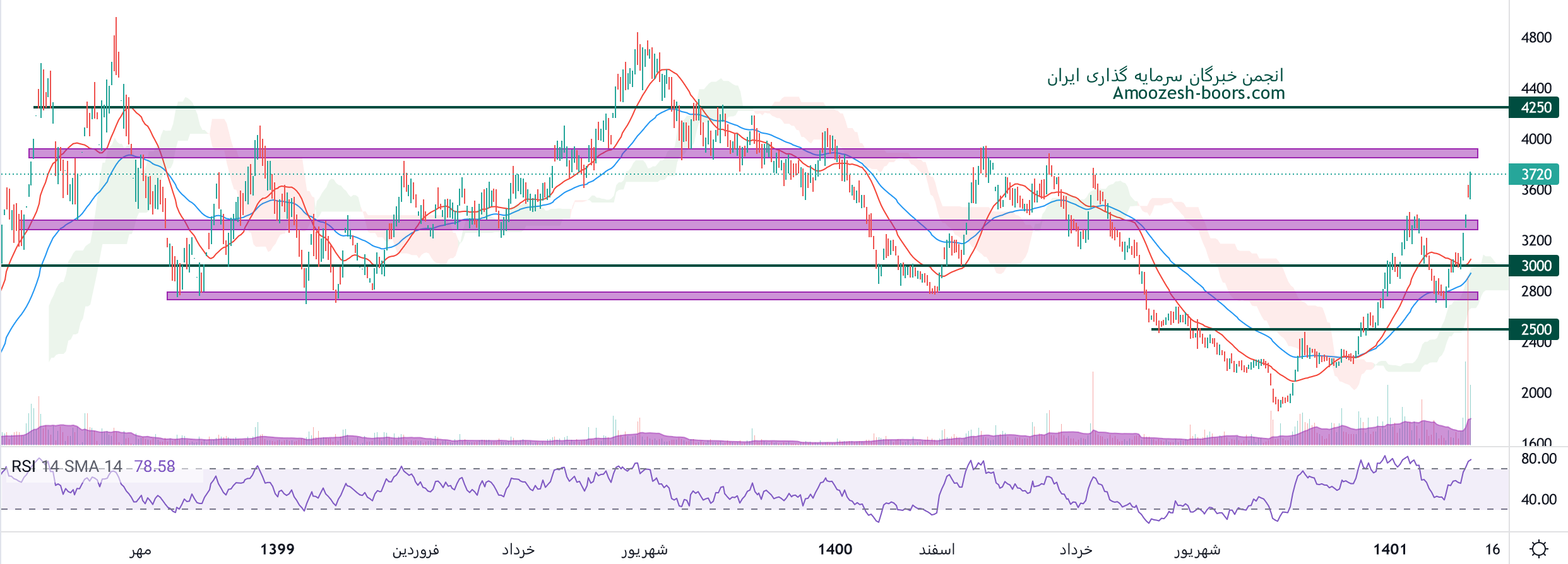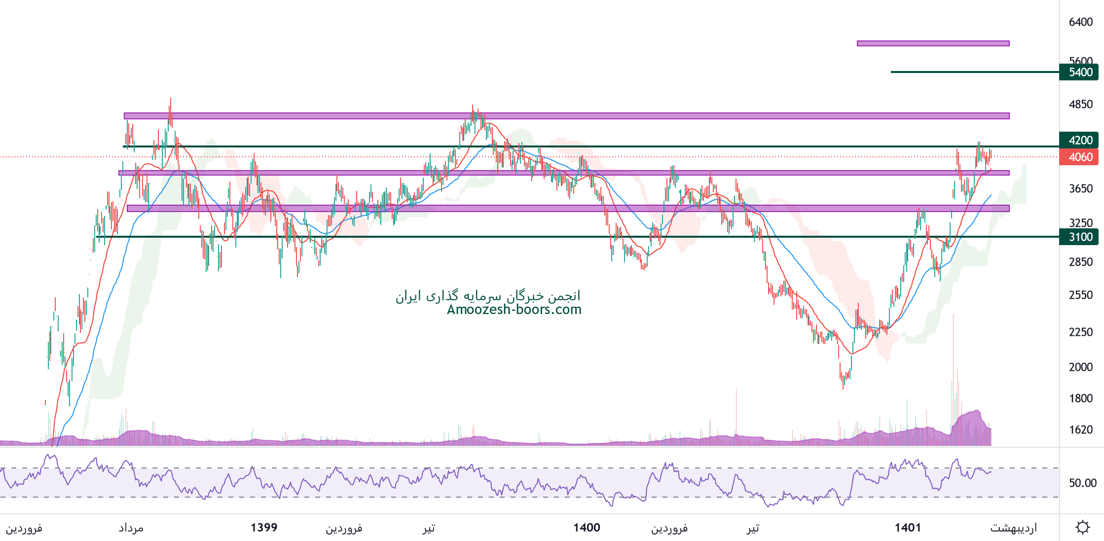 نماد فخوز در حال حاضر نزدیک به محدوده مقاومتی 4000 ریال قرار دارد، در صورت ادامه دار شدن روند صعودی سهم فخوز، وعبور از این محدوده مقاومتی، مقاومت بعدی 4250 ریال در نظر گرفته خواهد شد، همچنین در صورت اصلاح سهم، اولین حمایت 3300 ریال ارزیابی میگردد.