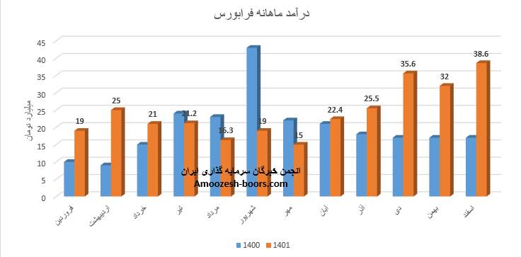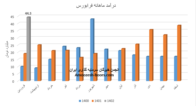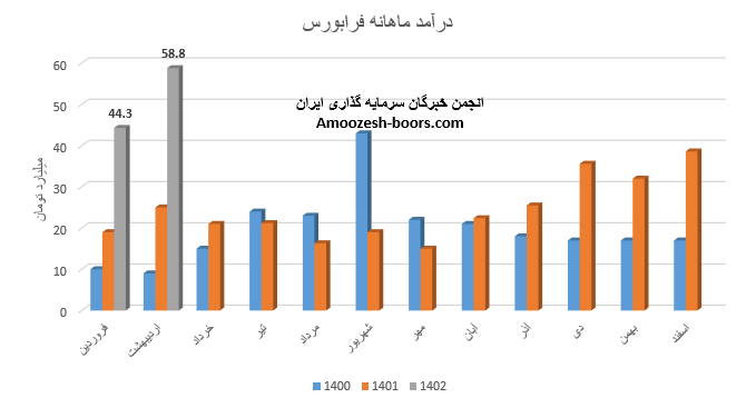 شرکت فرابورس ایران فرابورس در فروردین ماه سال 1402 درآمد خیره کننده 44.3 میلیارد تومان را محقق نموده است، به طوری که نسبت به ماه گذشته 15% و نسبت به مدت مشابه 133% افزایش داشته است، عمده علت افزایش درآمد، افزایش 6 درصدی حق عضویت کارگزاران و افزایش 18 درصدی کارمزد معاملات میباشد.