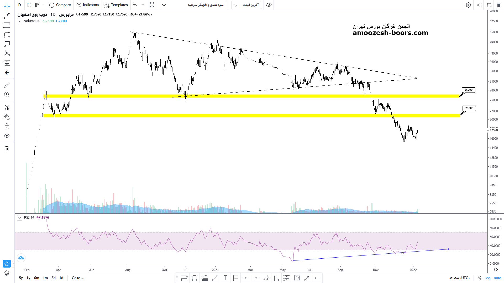 با توجه به 50 درصد اصلاح بیشتر از زمانیکه کف الگوی قیمتی به پایین قطع شده و شدت گیری مومنتوم نزولی، اکنون قیمت در حال تشکیل سقف و کفی بالاتر از یکدیگر میباشد در صورت شکل گری سقف و کفی بالاتر از یکدیگر، قیمت اهداف 2100 و 2600 را به ترتیب پیش روی خود میبیند که میتواند صعود خود را تا این محدوده ها ادامه دهد