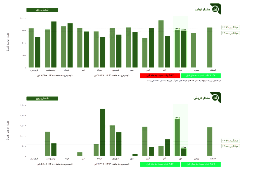 مقدار شمش روی شرکت در دی ماه 383 تن بوده که نسبت به ماه گذشته 54 درصد افت داشته است.افت مبلغ فروش طی یکماهه دی به دلیل کاهش مقداری محصول ذوب روی اصفهان بوده است .