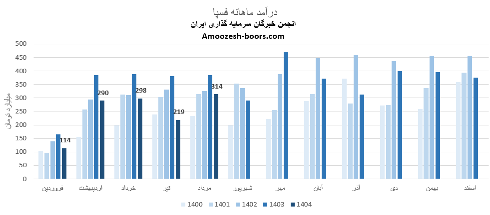 سهام فسپا از ابتدای سال مالی تا پایان مرداد 1404، مجموع درآمد ثبت شده شرکت به 1234 میلیارد تومان رسیده که نسبت به مدت مشابه سال گذشته 28 درصد افت داشته، و در همین حال 29 درصد از کل درآمد سال گذشته تحقق یافته است.
