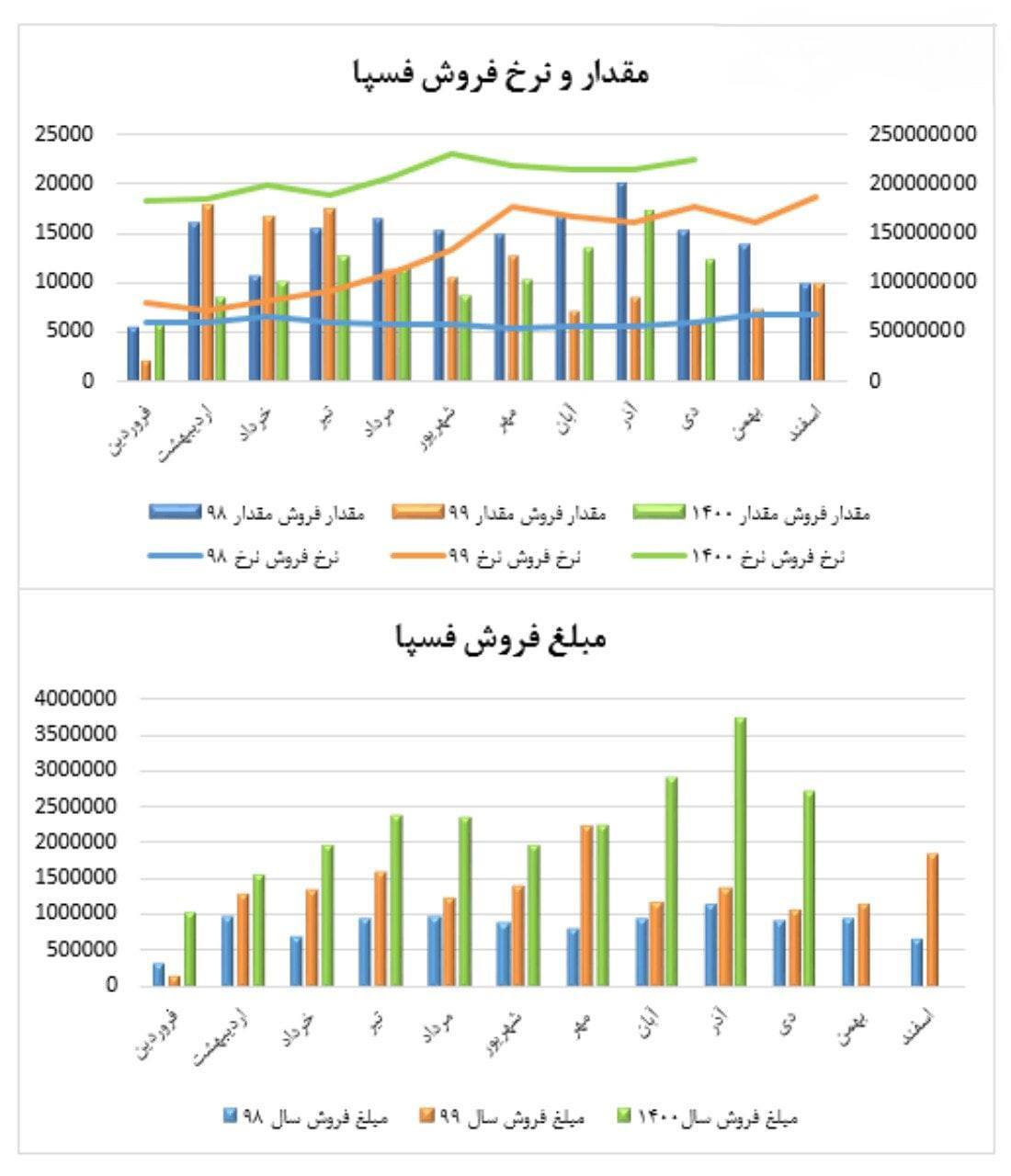 درآمد شرکت در این دوره نسبت به ماه قبل 38% افزایش و نسبت به میانگین ماه های قبل 55% افزایش داشته است. شرکت نسبت به دوره 1 مشابه سال قبل 95% افزایش درآمد داشته است.مقدار فروش کل محصولات شرکت در اسفند ماه 17 هزار تن گزارش شده است که این عدد در ماه قبل 12 هزار تن بوده است.