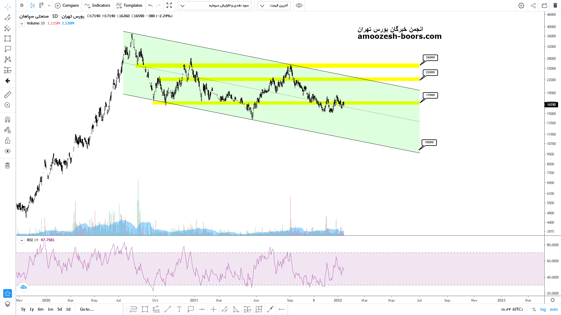 با توجه به خنثی شدن روند کوتاه مدتی و درگیری قیمت با محدوده حمایتی پر تراکم 1500 الی 1700 تومان و با توجه به واگرایی صعودی اندیکاتور قیمت محدوده مقاومتی سقف کانال یعنی محدوده 2200 تومان و درصورت شکست محدوده 2600 تومان رابر سر راه خود خواهد دید