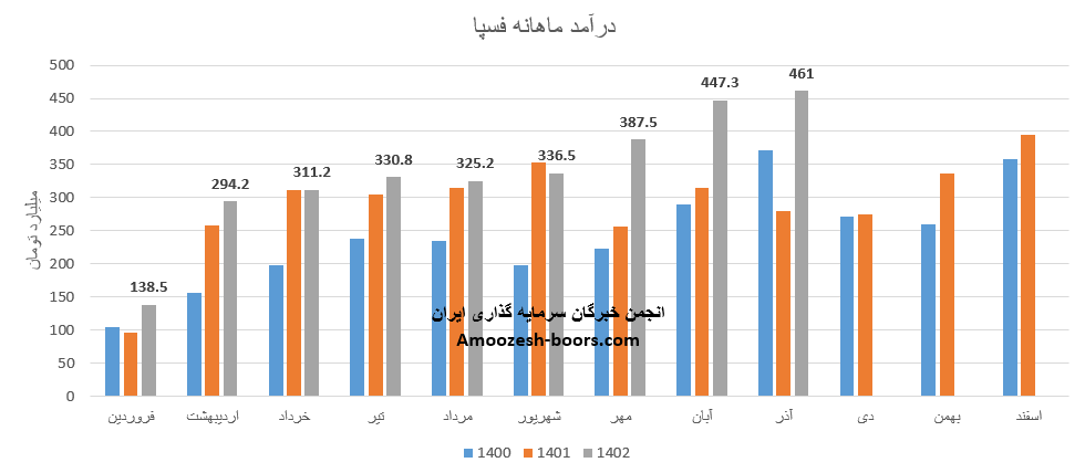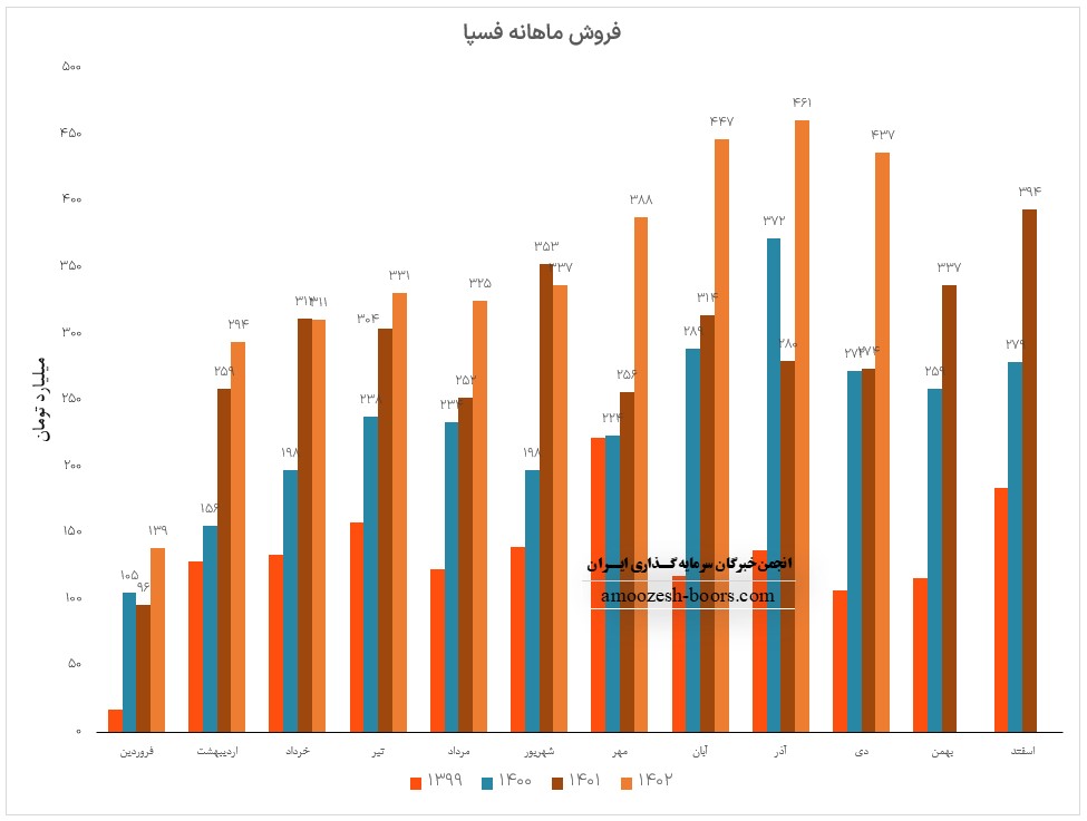 فروش آذر ماه سال 1402 سهم فسپا 461 میلیارد تومان گزارش شده است که 83% از این رقم از طریق فروش داخلی و مابقی از طریق صادرات تامین گردیده است، تغییرات درآمدی فسپا به شرح زیر میباشد: