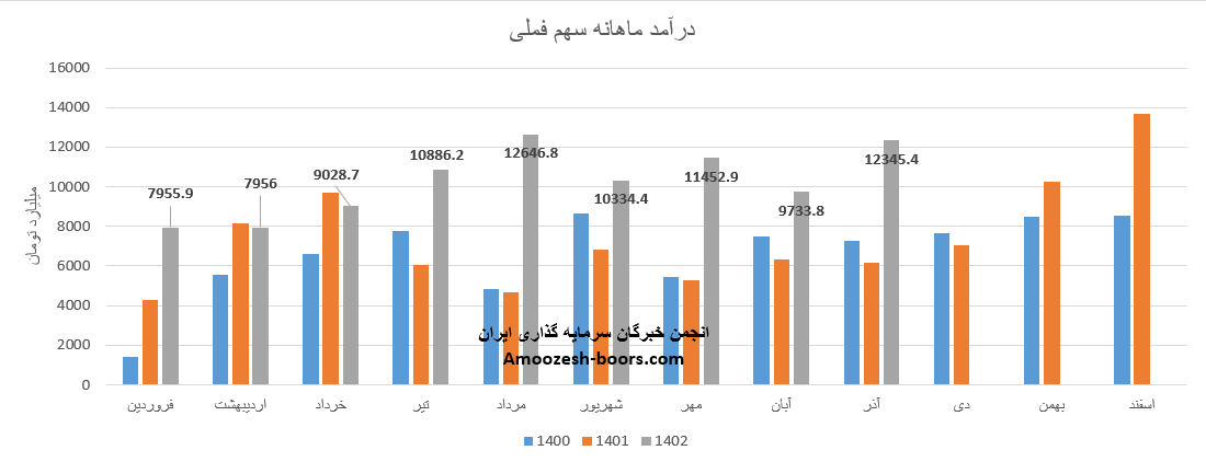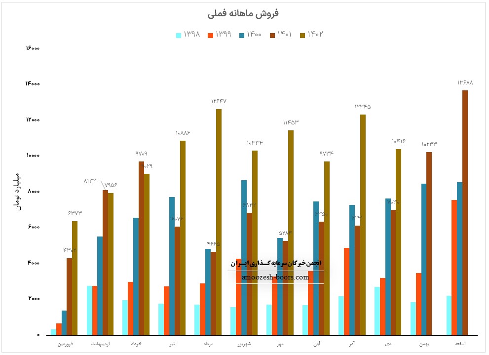 فروش آذر ماه سال 1402 سهم فملی 12345.4 میلیارد تومان گزارش شده است که 92% از این رقم از طریق فروش داخلی و مابقی از طریق صادرات تامین گردیده است، تغییرات درآمدی فملی به شرح زیر میباشد: