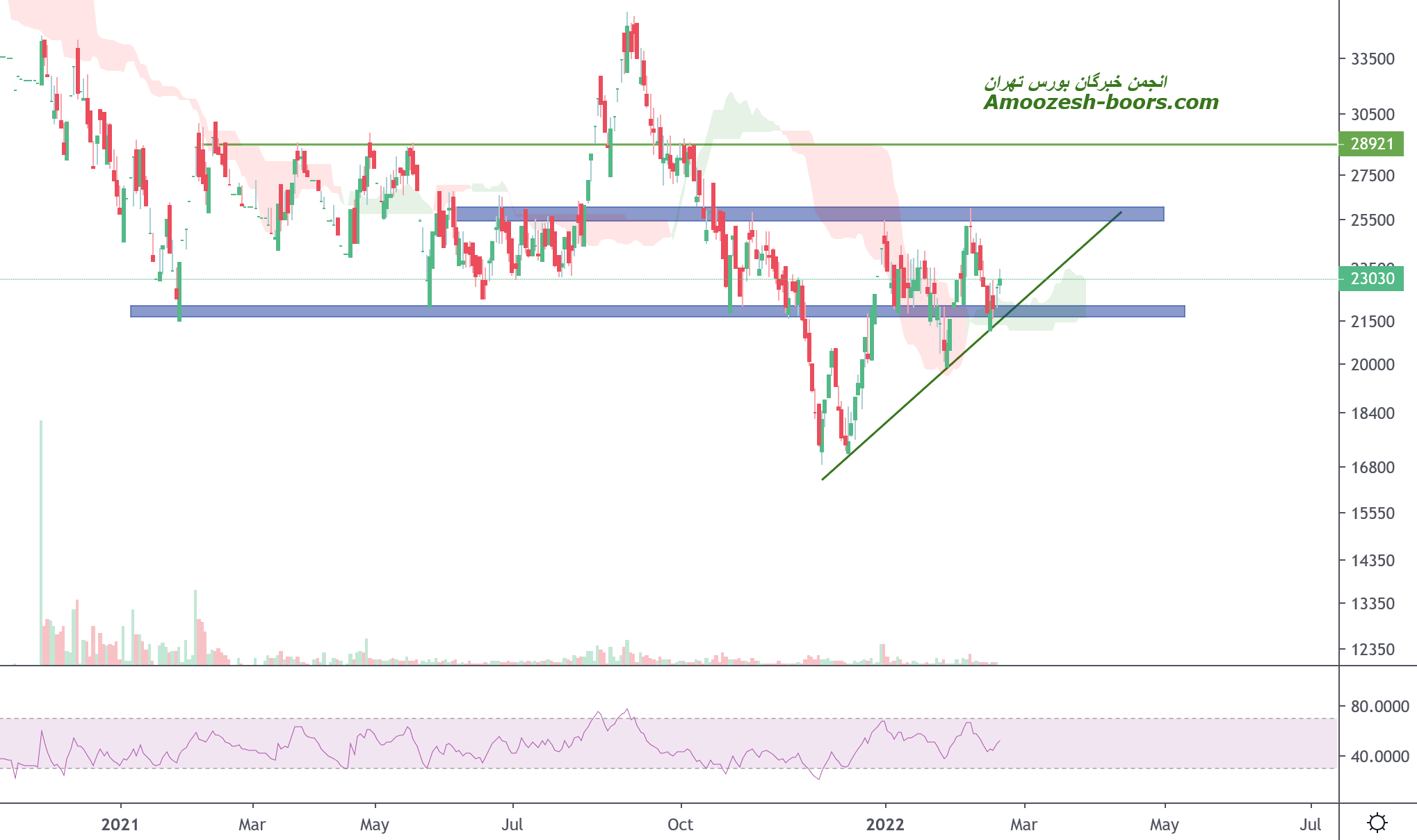 قیمت در حال حاضر بعد از واکنش مثبت به خط روند صعودی خود به سمت محدوده مقاومتی استاتیک 25500 ریال در حرکت است در صورت ادامه فشار خرید و شکست این محدوده مقاومتی،مقاومت بعدی 28700 ریال خواهد بود و در صورت نزول اولین و دومین حمایت به ترتیب 22000 ریال و 23000 ریال خواهد بود.