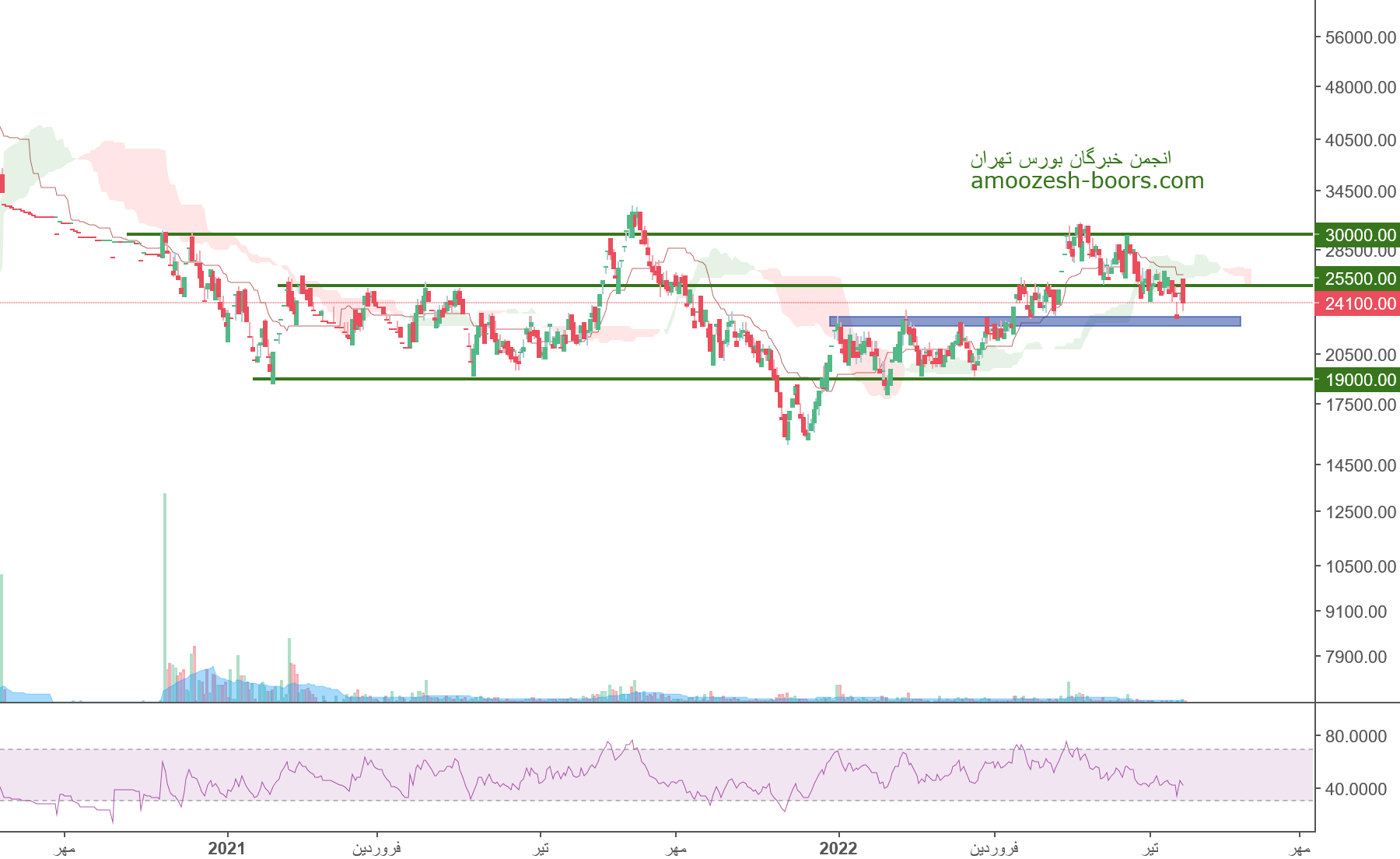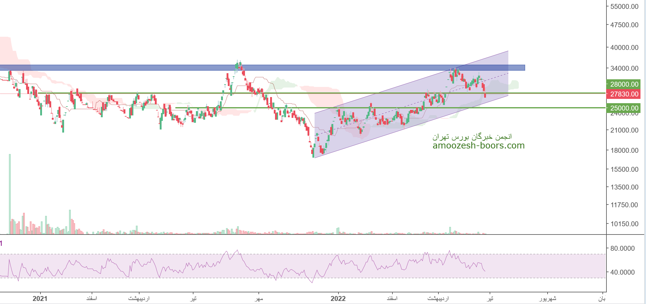 بلحاظ تکنیکالی قیمت در حال حاضر کف کانال بلند مدتی خود در محدوده 26000 ریال قرار دارد در صورت تثبیت قیمت حرکت سهم تا 28000 ریال محتمل خواهد بود،همچنین در صورت از دست رفتن حمایت نزول سهم تا25000 ریال دور از ذهن نخواهد بود.