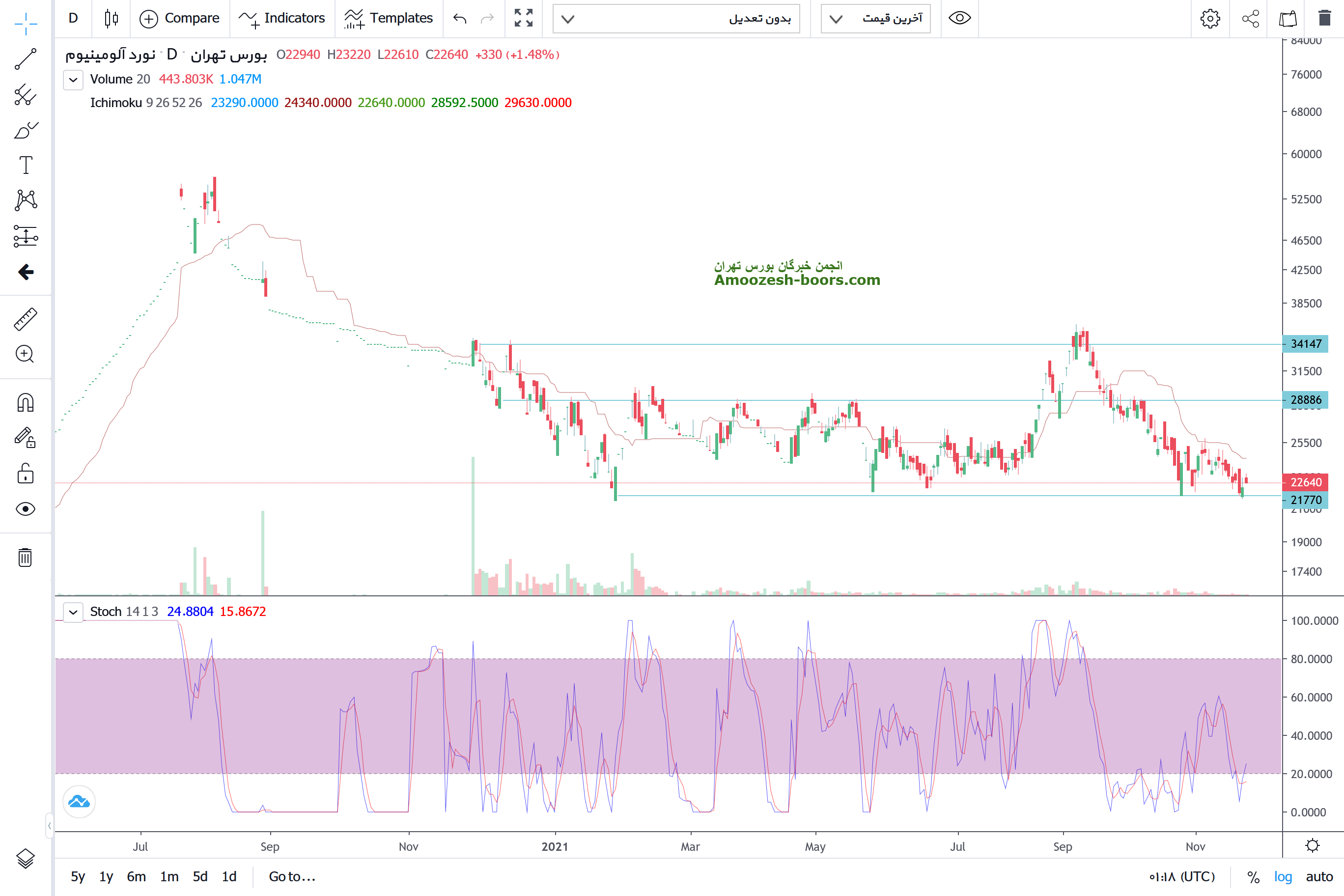 قیمت در حال حاضر با ایجاد واگرایی مثبت و برگشت استوکستیک از منطقه اشباع فروش، در حال حاضر درمنطقه کم ریسک حمایت استاتیک 22000 واقع شده در صورت شکست محدوده پرتراکم 24000 تارگت 30000 و 34000 را به ترتیب بر سر راه سهم قرار دارد. همچنین رعایت حد ضرر 21500 برای سهامداران الزامیست.