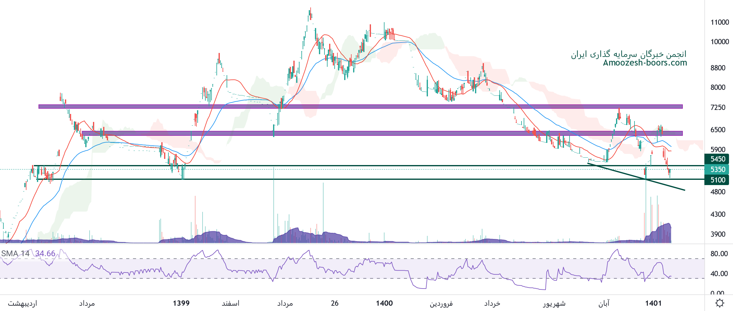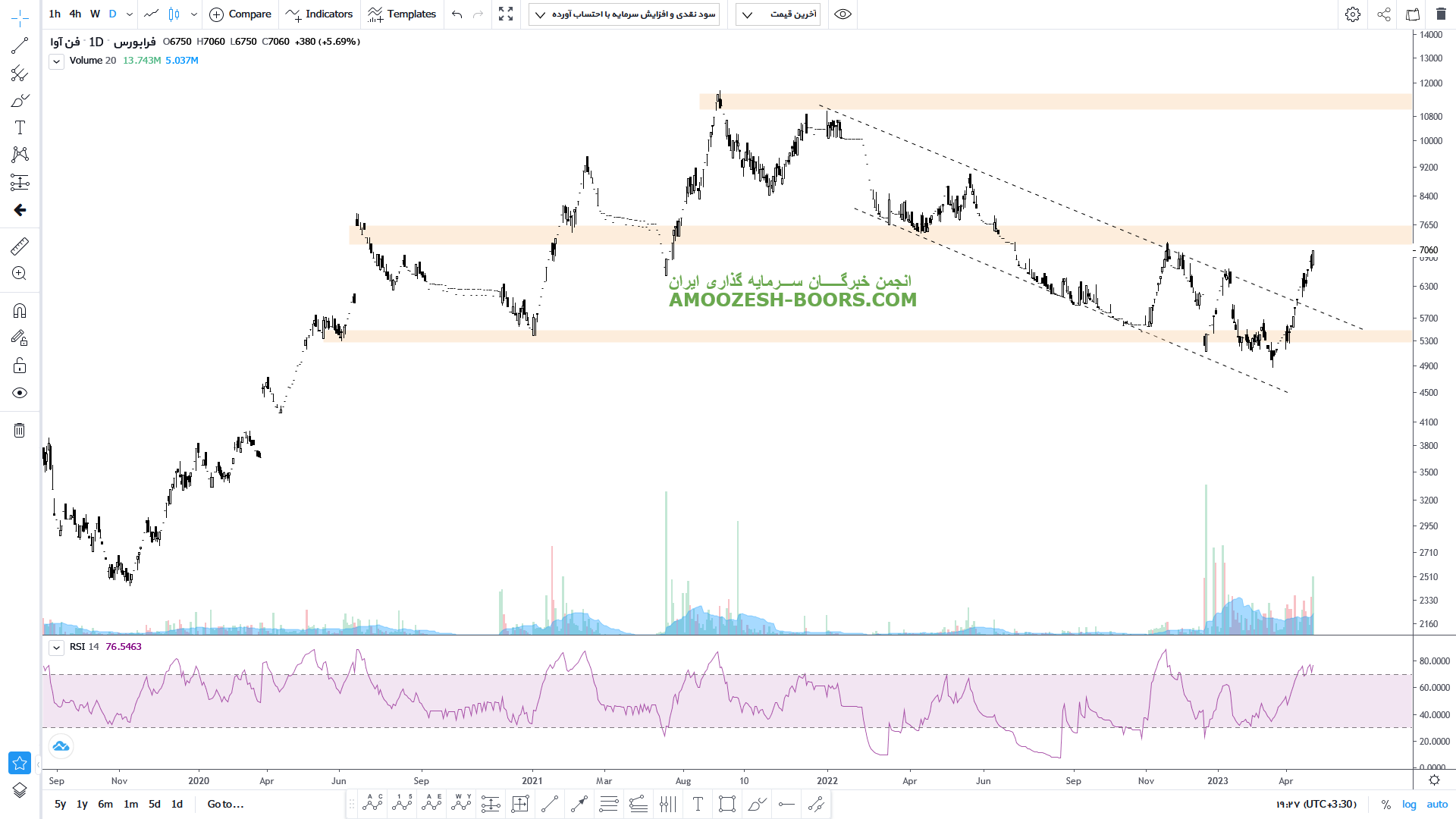 نماد فن آوا در کانال نزولی قرار دارد، و در حال اصلاح نیز میباشد، 5000 ریال اولین محدوده حمایتی سهم فن آوا در نظر گرفته خواهد شد، همچنین در صورت بروز نشانه های برگشتی و ایجاد کندل های صعودی، مقاومت های سهم فن آوا 7500 و 8500 ریال خواهند بود.