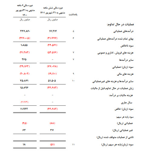 زیان عملیاتی: ۶ میلیارد تومان که نسبت به دوره مشابه سال گذشته ۲۰۳ % افزایش پیدا کرده است