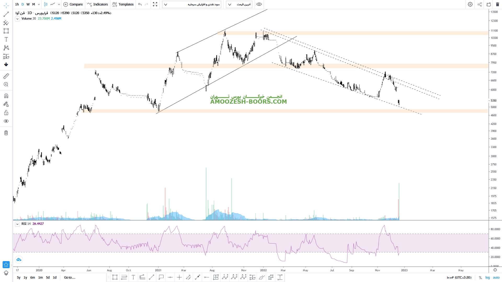 قیمت سهام فن آوا در قالب یک کانال نزولی در حال اصلاح می باشد که اکنون با برخورد به ناحیه کف این کانال حجم فوق العاده بالایی خورده و هدف سقف کانال نزولی را پیش روی خود دارد که میتواند با شکست آن رشد خود را تا مقاومت مهم ناحیه ۷۸۰ تومان نیز ادامه دهد.