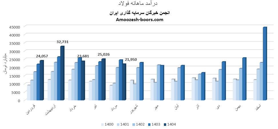 گزارش فعالیت ماهانه نماد فولاد در اردیبهشت ماه سال 1404 نشان میدهد که این شرکت در این بازه زمانی توانسته است به درآمد 32730.8 میلیارد تومان دست یابد، این رقم نسبت به ماه مشابه سال گذشته 24 درصد افزایش داشته است؛ همچنین در مقایسه با ماه گذشته تغییر 36+ داشته است.