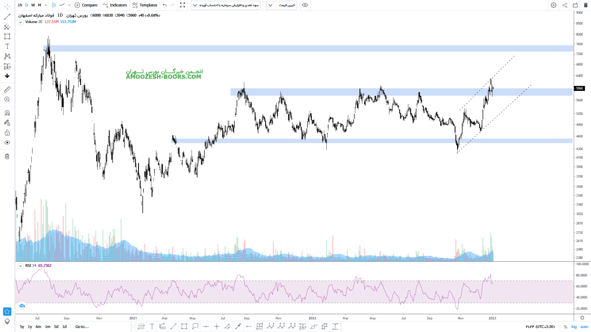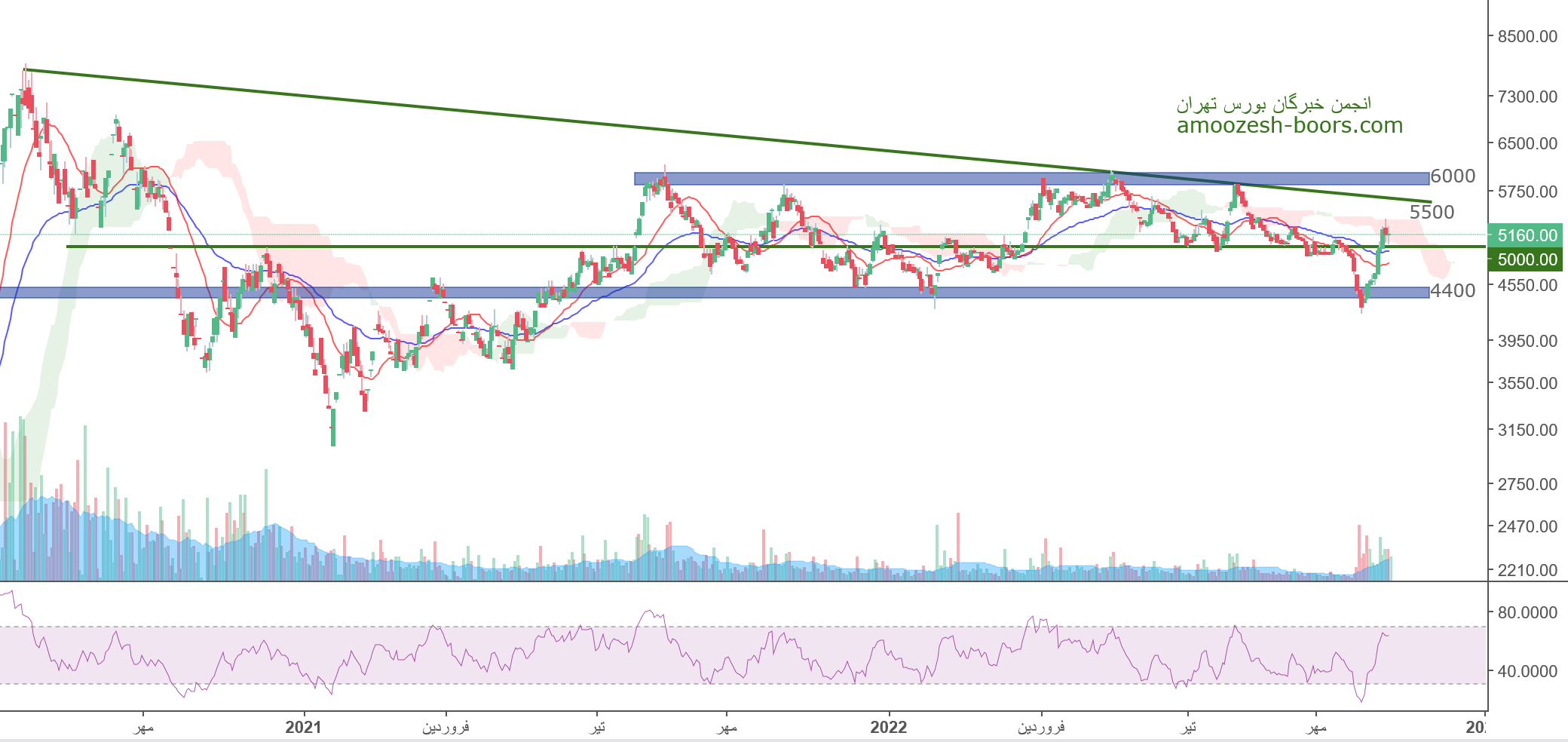 قیمت سهم فولاد در حال عبور از مقاومت 5000 ریال میباشد، در صورت تثبیت بالای این مقاومت، حرکت سهم تا 5500 ریال محتمل میباشد، همچنین در صورت ورود سهم به فاز اصلاحی، اولین حمایت سهم فولاد 4400 ریال در نظر گرفته خواهد شد.