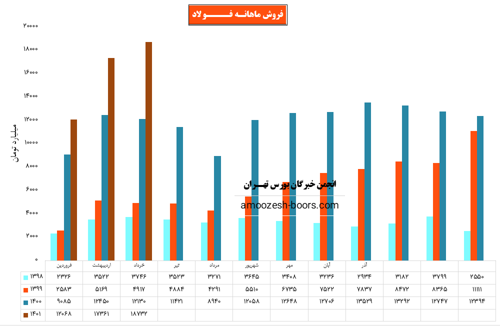 سهم فولاد (شرکت فولاد مبارکه اصفهان) در تیر ماه سال ۱۴۰۱ حدود مبلغ 12431 میلیارد تومان فروش داشته که این میزان در مقایسه با ماه گذشته 34% افت و همچنین در مقایسه با مدت مشابه سال گذشته حدود 9% افزایش درآمد پیدا کرده است.