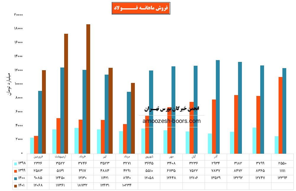 فولاد در اردیبهشت فروش فوقالعاده 173.612 میلیارد ریالی را ثبت کرده است که رشد 44 درصدی نسبت به ماه فروردین نشان می دهد. این مقدارفروش در فروردین سال جاری و مدت مشابه سال گذشته 120.678 و 124.500 میلیارد ریال گزارش شده بود. (93%) درصد از درآمد شرکت درین ماه مربوط به فروش داخلی و (7%) درصد آن مربوط به کل صادرات شرکت است.