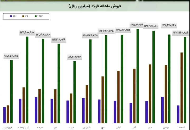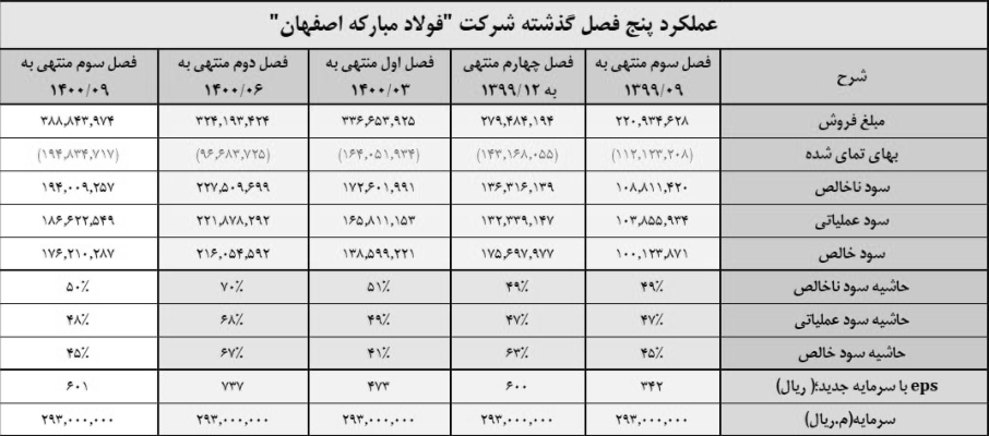 عملکرد شرکت فولاد مبارکه اصفهان در 9 ماهه 1400 با رشد همراه بوده است. فروش شرکت نسبت به مدت مشابه سال گذشته 123 درصد رشد داشته است و به 1،049 هزار میلیارد ریال رسیده است. شرکت در این دوره موفق به فروش بیش از 5,426 هزار تن انواع محصولات شده است.