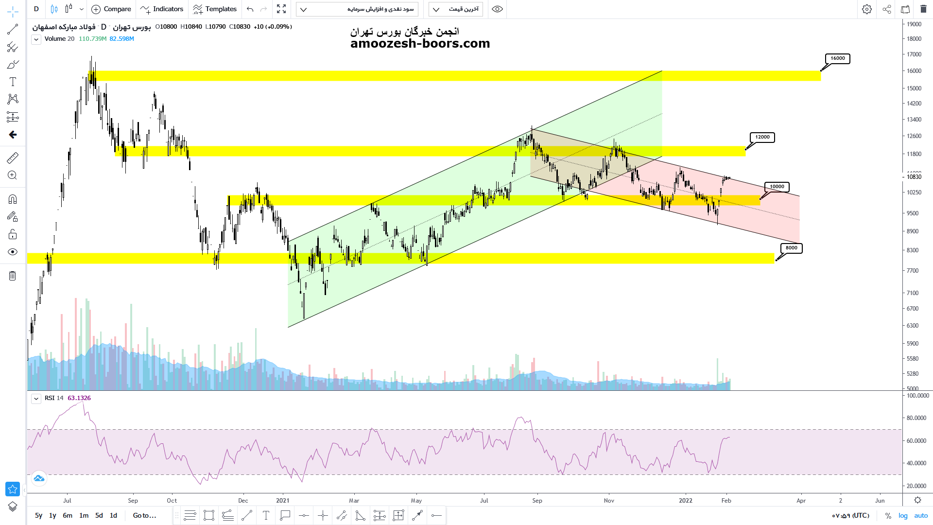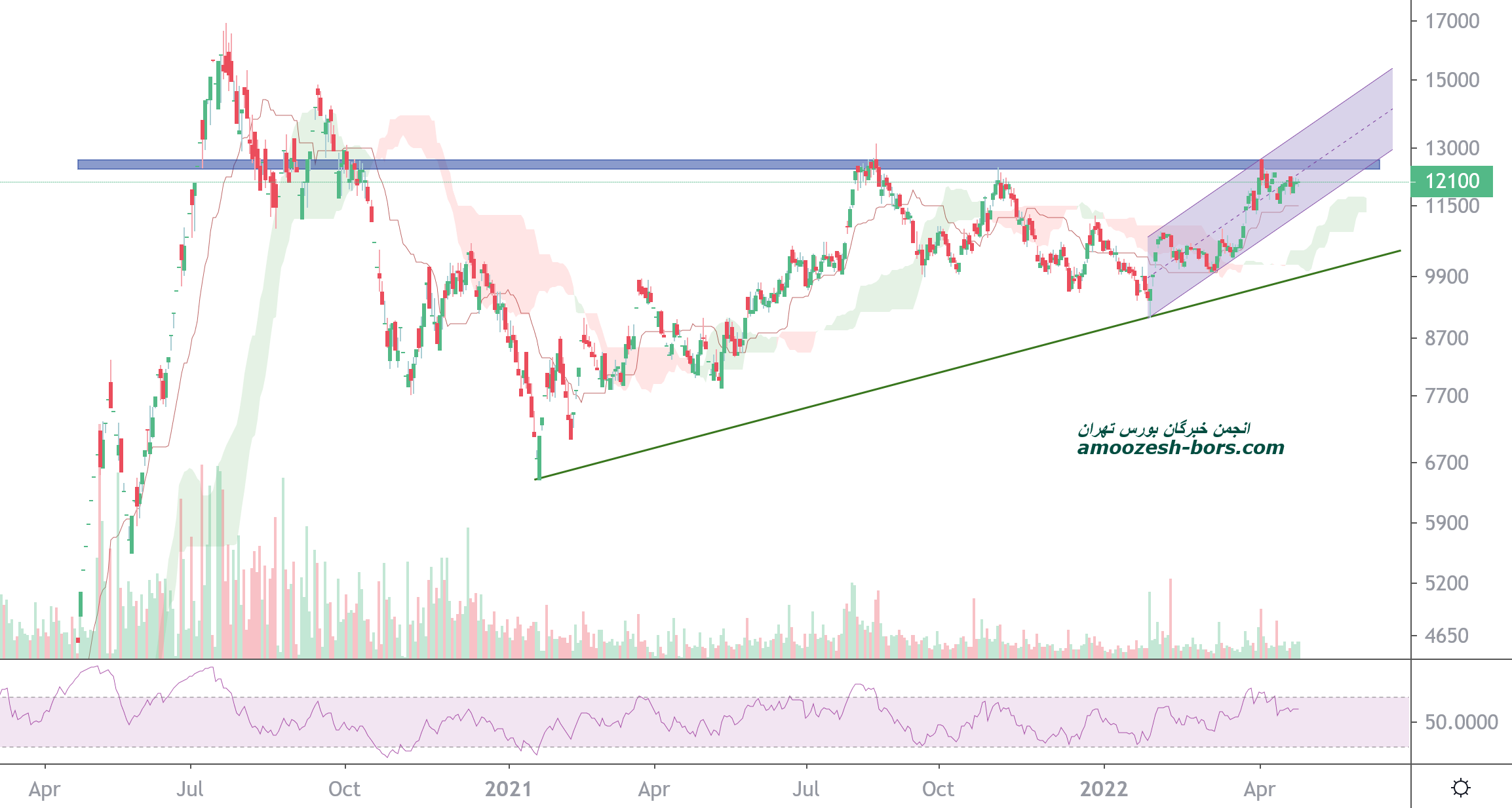 قیمت در حال حاضر در کانال صعودی کوتاه مدتی درگیر مقاومت میدلاین کانال و محدوده مقاومتی استاتیک خود میباشد در صورت افزایش فشار تقاضا و عبور از این مقاومت حرکت قیمت تا سقف کانال صعودی کوتاه مدتی محتمل خواهد بود و در صورتی که سهم وارد فاز اصلاحی شود اولین حمایت سهم کف کانال صعودی کوتاه مدتی در نظر گرفته خواهد شد.