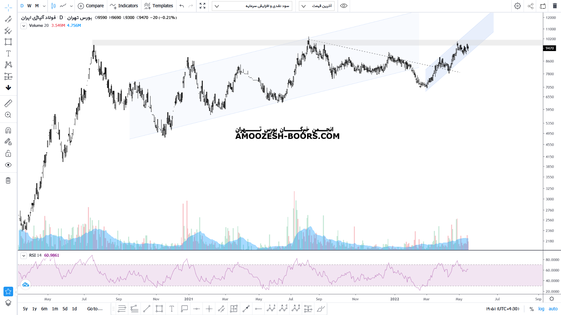قیمت پس از شکست خط روند نزولی خود و پولبک به آن توانسته رشد خود را تا محدوده مقاومتی سقف تاریخی خود یعنی محدوده هزار تومان ادامه دهد که این رشد را توانسته در قالب یک کانال صعودی به انجام برساند اکنون نیز درگیر مقاومت مهدوی سقف تاریخی خود میباشد که در صورت بروز واکنش منفی به این محدوده مقاومتی مهم می تواند تا اولین حمایت خود یعنی محدوده کف کانال صعودی یعنی محدوده ۹۰۰ تومان و یا صورت شکست تا محدوده حمایتی ۸۰۰تومان اصلاح خود را ادامه دهد اما در صورت بروز واکنش مثبت و شکست این محدوده مقاومتی مهم هدف سقف کانال صعودی خود را پیش روی خود دارد.