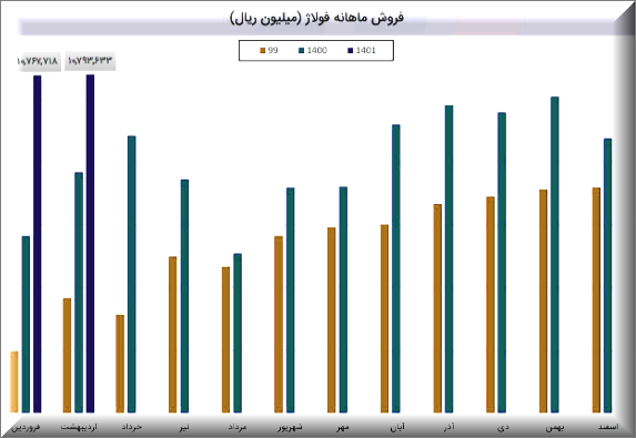 (74%) درصد از درآند شرکت درین ماه مربوط به فروش داخلی و (26%) درصد آن مربوط به کل صادرات شرکت است. شرکت در دوره یک ماهه منتهی به 31 فروردین ماه، مبلغ 787.8 میلیون تومان را به عنوان برگشت از فروش ثبت کرده است. شرکت نسبت به دوره 1 ماهه مشابه سال قبل 91% افزایش درآمد داشته است.این رقم در مقایسه با میانگین درآمد 3 ماهه زمستان درآمد ماه گذشته و همچنین مدت مشابه سال قبل با رشد 14 و 23 و 90 درصدی همراه بوده است. نرخ فروش فولاد آلیاژی نیز با شیب نسبتا تندی افزایشی بوده است. تولید فروردین ماه 38 هزار تن گزارش شده است. میانگین تولید ماهانه سال 99، 39 هزار تن و سال 1400، 38 هزار تن میباشد.در فروردین 44 هزار تن فروش ثبت شده ، میانگین فروش ماهانه سال 1400، 36 هزار تن و میانگین فروش ماهانه سال 99، 39 هزار تن بوده است.