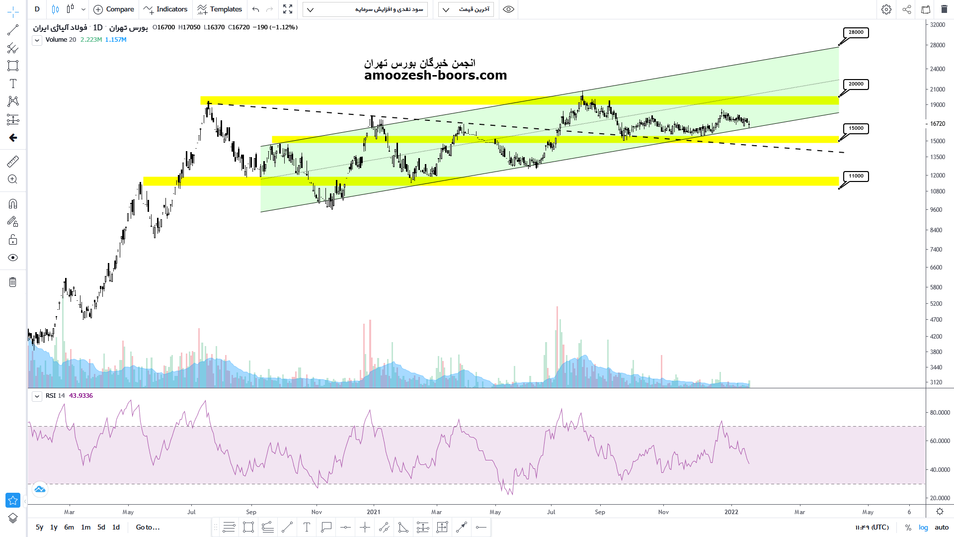 قیمت پس از فشردگی که در 4 ماه اخیر تجربه کرده به محدوده حمایتی کف کانال نزدیکه شده است که در صورت حمایت از این محدوده پر تراکم حمایتی 1400 الی 1600 تومان میتواند در ابتدا تا مقاومت مهم 2000 تومان و سپس در صورت شکست تا محدوده سقف کانال یعنی 2800 تومان نیز صعود خود را ادامه دهد اما درصورت عدم حمایت از این محدوده و شکست حمایت پر تراکم 1400 الی 1600 تومان اصلاح بیشتر تا محدوده 1100 تومان نیز ادمه خواهد داشت
