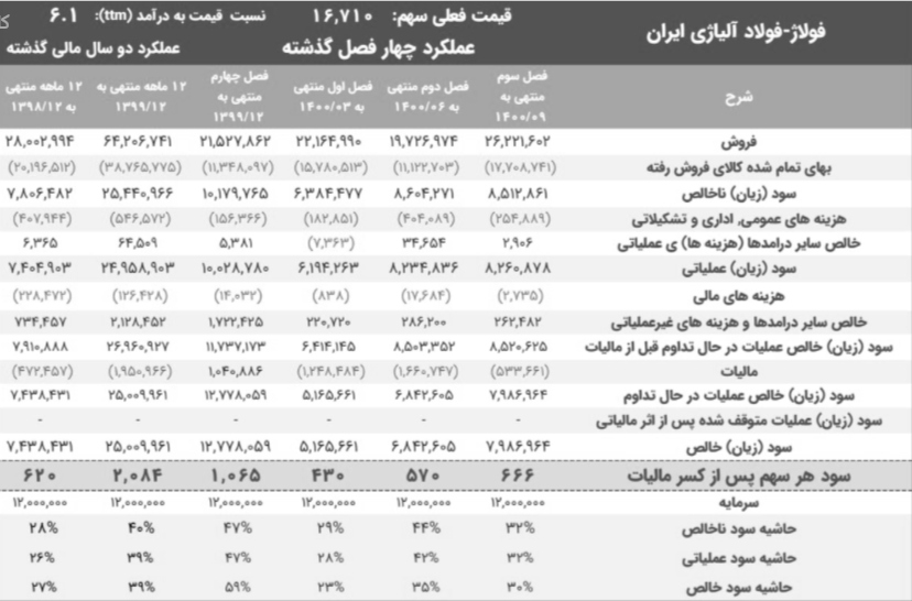 نرخ فروش فولاد آلیاژی نیز پس از کاهش 10 درصدی در مهر ماه، در صدد جبران این افت، مقداری افزایشی شده است. نرخ این محصول نسبت به ماه گذشته و میانگین نه ماهه 2 درصد افزایش داشته است. برای پیشبینی سود کوارتر چهارم اندکی زود است اما با توجه فروش دی ماه که فاصله قبل قبولی تا میانگین فروش ماههای گذشته دارد بنظر زمستان نسبتا خوبی در انتظار فولاژ است. همچنین تحلیلگران معتقدند فولاژ در پایان سال مالی پتانسیل تحقق سود 250-270 تومانی را دارد.
