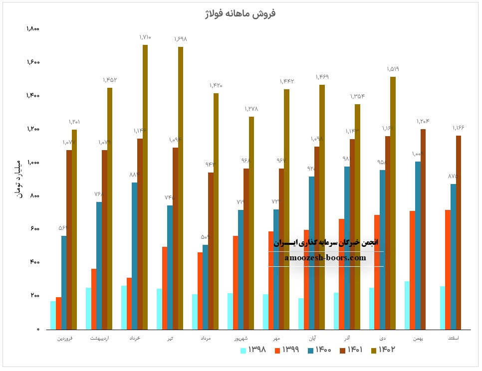 نماد فولاژ در اسفند ماه از طریق فروش داخلی به فروش 1542.5 میلیارد تومانی دست یافت که 96% از این فروش داخلی و 4% را صادرات تشکیل داده است.