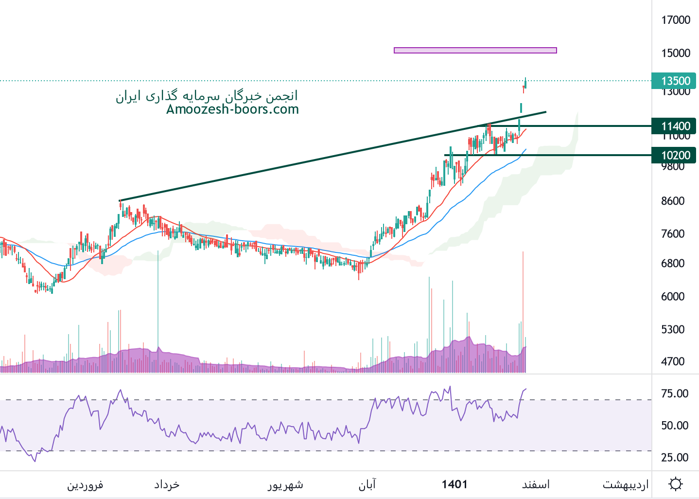 نماد فولاژ که در روند صعودی پر قدرتی قرار دارد محدوده مقاومتی 15000 ریال را پیش رو دارد، همچنین حمایت های سهم 12000 و 11400 ریال ارزیابی میگردد، باید انتظار داشت سهم براس تست سطوح حمایتی به محدوده های حمایتی خود بازگردد.