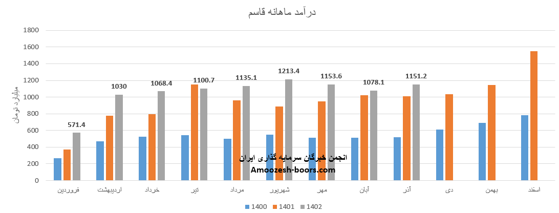 فروش آذر ماه سال 1402 سهم قاسم 1151.2 میلیارد تومان گزارش شده است، تغییرات درآمدی قاسم به شرح زیر میباشد: