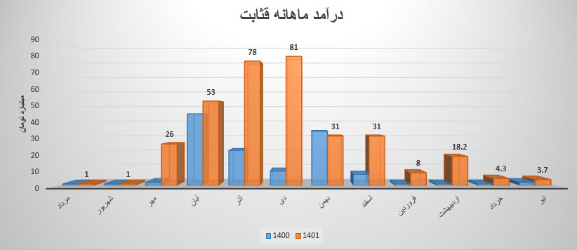 سهم قثابت در انتهای خرداد ماه مبلغ 4.3 میلیارد تومان درآمد داشته ک ه نسبت به ماه قبل 76% کاهش و نسبت به میانگین ماه های قبل 67% کاهش و نسبت به دوره 1 ماهه مشابه سال قبل 337% افزایش درآمد داشته است.