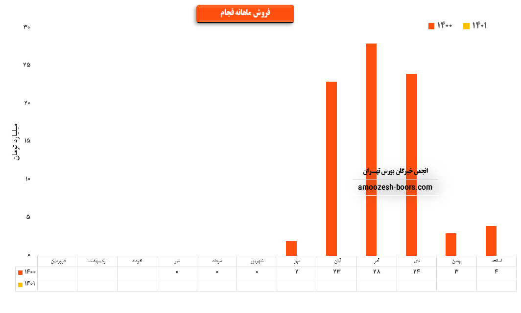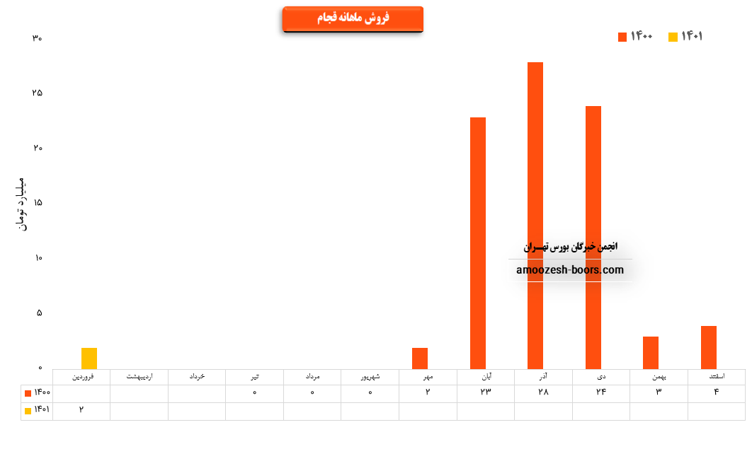نماد قجام در فروردین ماه حدود بیش از 228 تن از محصولات خود را به فروش رساند که این میزان در مقایسه با حجم فروش اسفند ماه ماه حدود 65% کاهش پیدا کرده است.