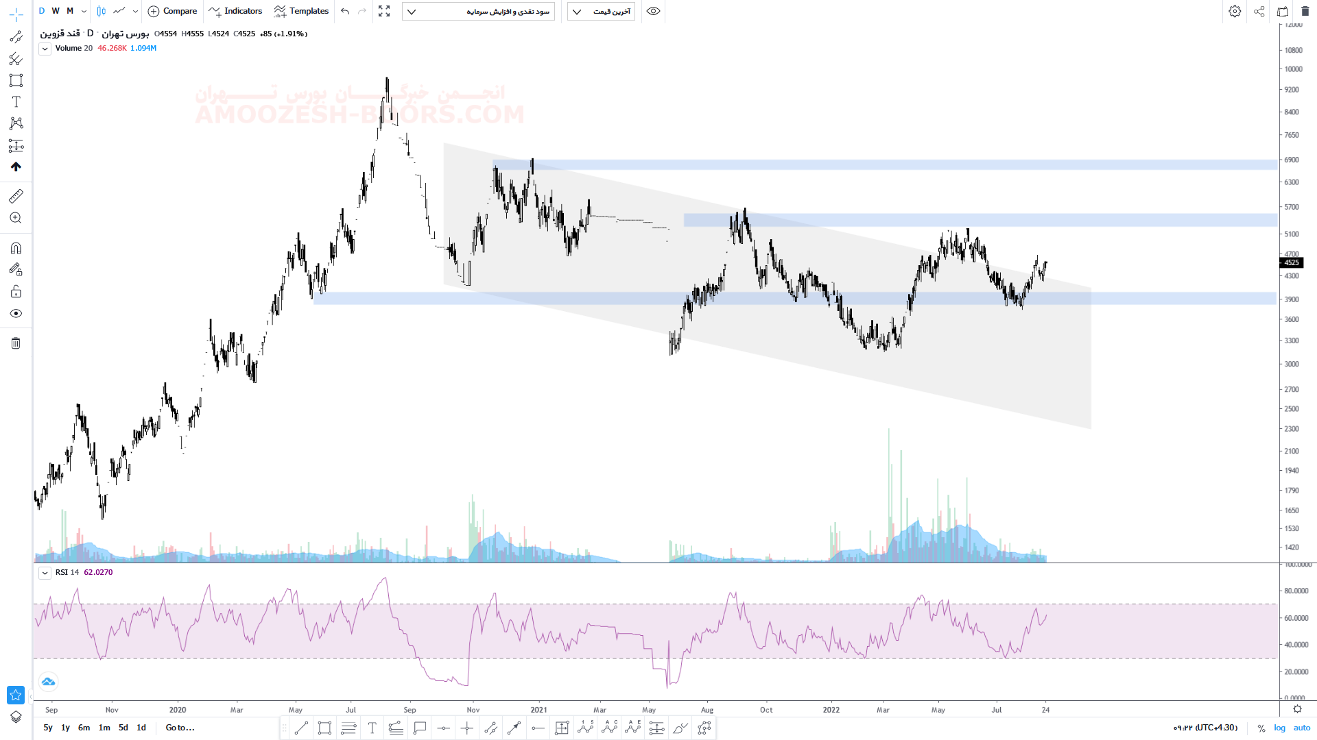 قیمت نماد قزوین پس از خروج از سقف کانال نزولی خود مجدد به درون کانال بازگشته و تا ناحیه حمایتی ۴۰۰ تومان اصلاح خود را ادامه داده است اکنون نیز پس از برخورد به این ناحیه حمایتی مجدد رشد کرده و مقاومت ناحیه ۵۵۰ تومان را پیش روی خود دارد تا در صورت شکست آن بتواند رشد خود را تا ناحیه ۶۸۰ تومان نیز ادامه دهد اما در صورت افت مجدد ناحیه حمایتی ۳۹۰ تومان می تواند سد راه قیمت از ریزش بیشتر شود.