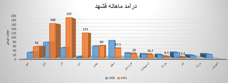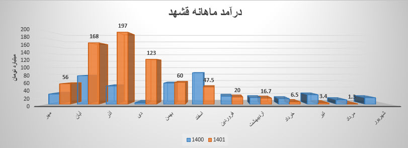 درآمد سهم قشهد در این دوره نسبت به ماه قبل 17% کاهش و نسبت به نسبت به دوره 1 ماهه مشابه سال قبل 9% کاهش درآمد داشته است.