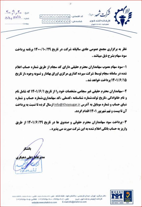 با توجه به برگزاری مجمع سالیانه در تاریخ 29 دی 1400 سود سهامدارانی که در سامانه سجام اهراز هویت شدند از تاریخ 15 شهریور 1401 به حساب مندرج در سامان سجام واریز خواهد شد و همچنین سود سهامدارانی که در سامانه سجام اهراز هویت نشدند ازتاریخ 1 شهریور 1401 با ارسال مشخصات به آدرس مندرج در نامه پیوست میتوانند نسبت به دریافت سود خود اقدام کنند