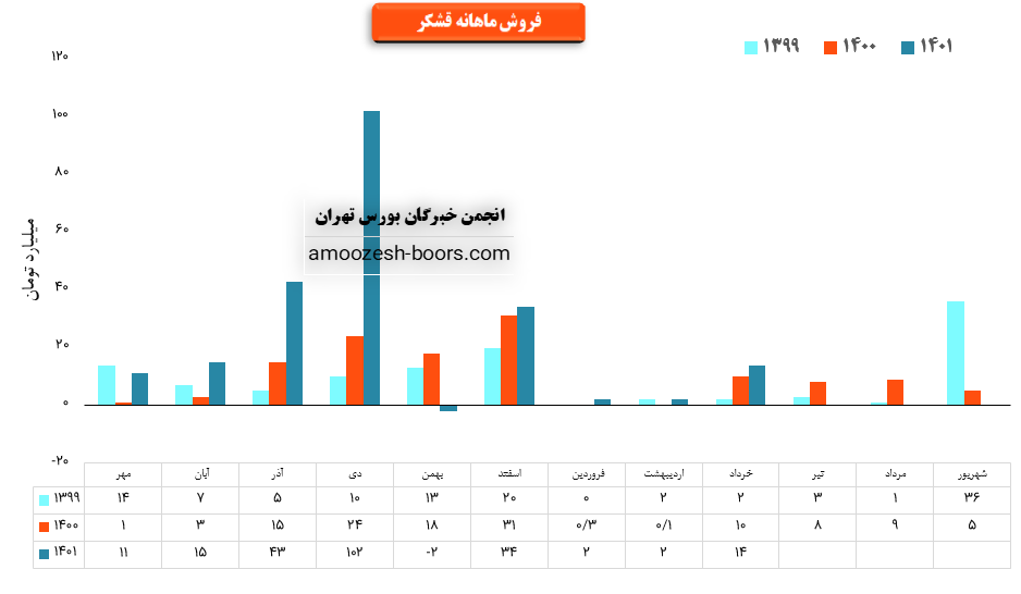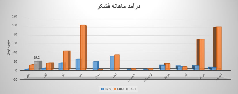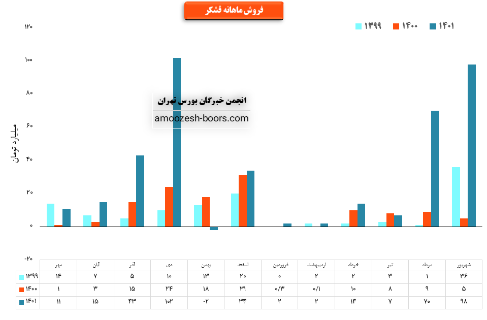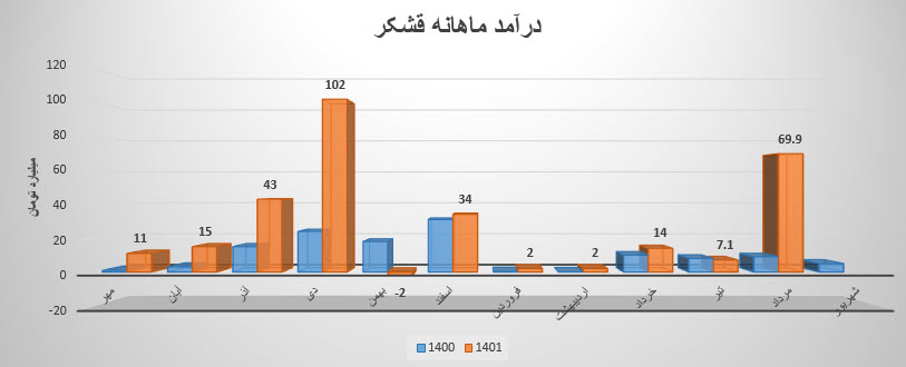 نماد قشکر در اولین ماه سال مالی خود معادل 192,007 میلیون ریال را شناسایی کرده که این رقم نسبت به دوره 1 ماهه مشابه سال قبل 75% افزایش داشته است. همچنین درآمد مهر ماه سهم قشکر در مقایسه با ماه گذشته 80 درصد و نسبت به میانگین ماهانه 40 درصد افت داشته است . شکر تولیدی از شکر خام که محصول استراتژیک این شرکت در نظر گرفته میشود با میزان فروش 60480 میلیون ریال سهم 31 درصدی از فروش این ماه را بخود اختصاص داده است .