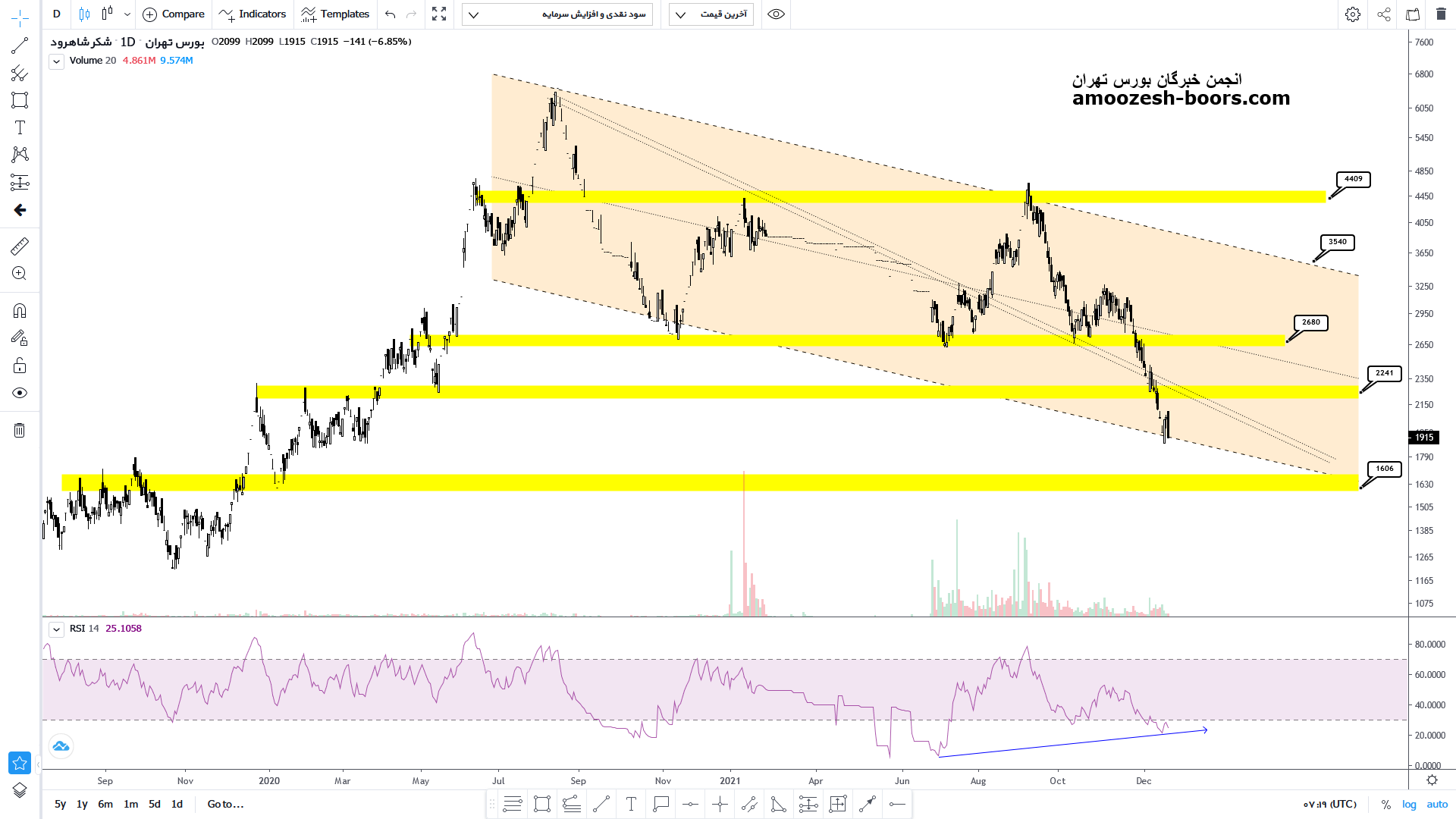 اما با توجه به واگرای مثبتی که در اندیکاتور و چارت مشاهده میشود، در صورت حمایت از کف کانال یعنی محدوده حمایتی 190 تومان، به ترتیب مقاومت های محدوده 220، 270 و 330 را در صورت شکست پیش روی خود خواهد دید