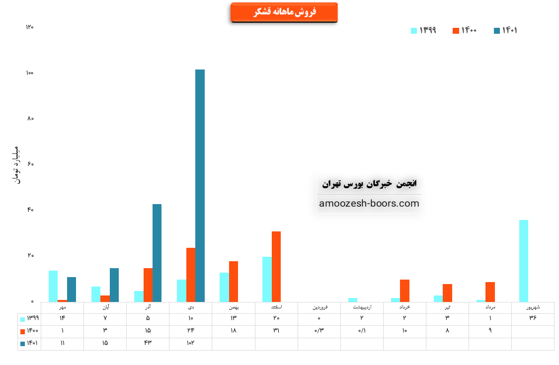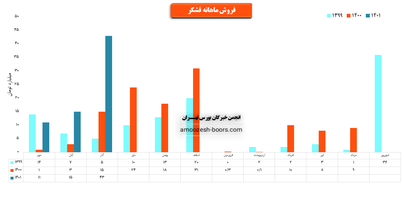 سهم قشکر در خصوص فروش 12 ماهه منتهی به مهر سال 1401 مبلغ 336 میلیارد تومان پیشبینی فروش داشته است که در مقایسه با فروش12 ماهه منتهی به مهر سال 1400 رشد 160 درصدی فروش پیشبینی شده است که دلیل آن جذب حداکثر شکر خام جهت تصفیه کارمزدی برای ایتام بعد از دوره بهره برداری چغندر قند میباشد.همچنین اتخاذ تصمیم در خصوص بهره برداری چغند قند پاییزه در برنامه تولید شرکت قرار گرفته است.