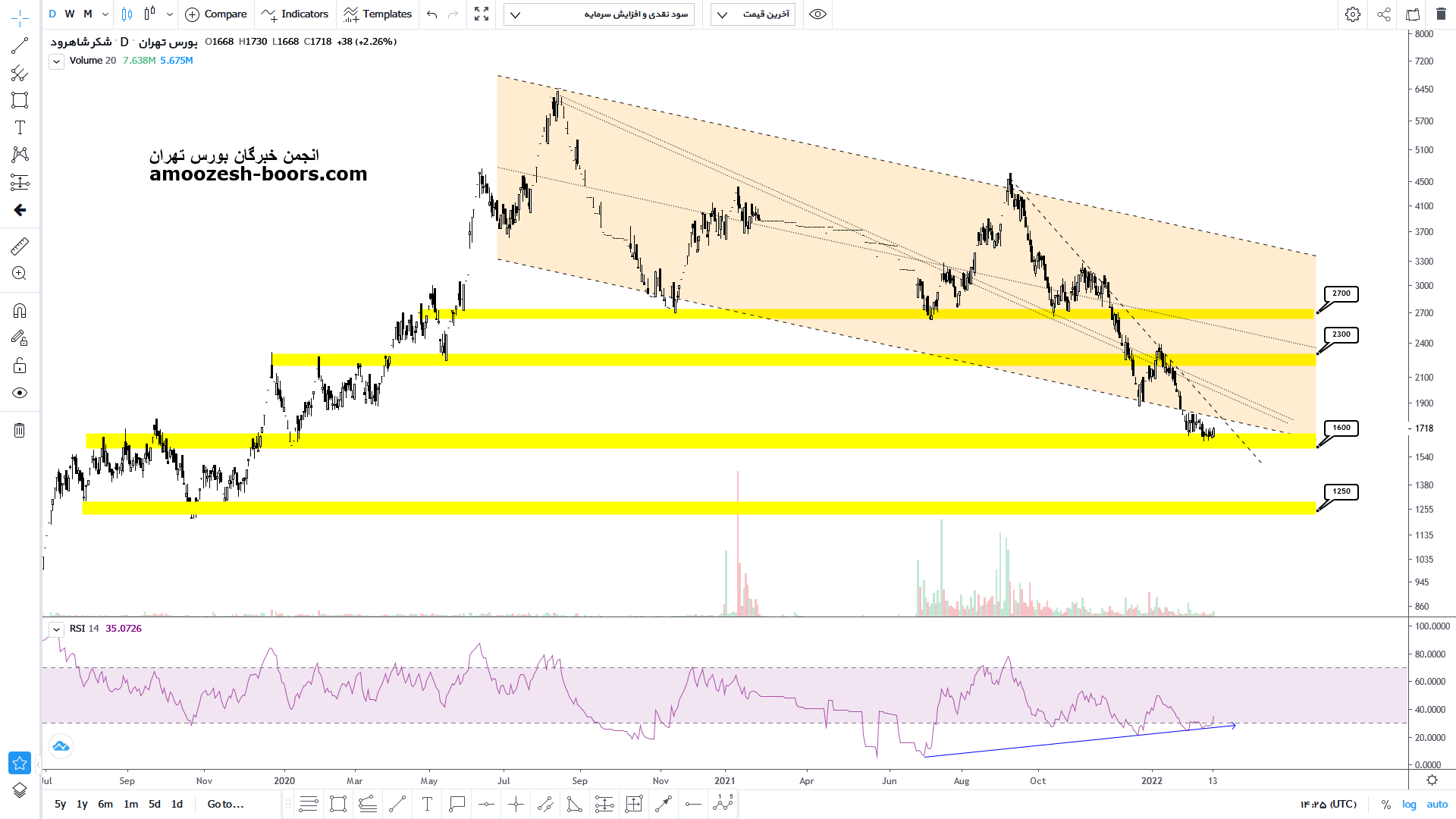 نماد قشکر پس از 70 درصد اصلاح از سقف تاریخی خود درون یک کانال نزولی 16 ماهه، اکنون به محدوده حمایتی کف کانال خود رسیده است که در صورت صعود با توجه به فشردگی مقاومت های مهم در آن محدوده، نسبت ریسک به ریوارد مطلوبی را جهت سرمایه گذاری ارائه نمیکند.