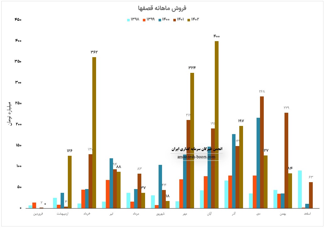 فروش آذر ماه سال 1402 سهم قصفها 196.6 میلیارد تومان گزارش شده است، تغییرات درآمدی قصفها به شرح زیر میباشد: