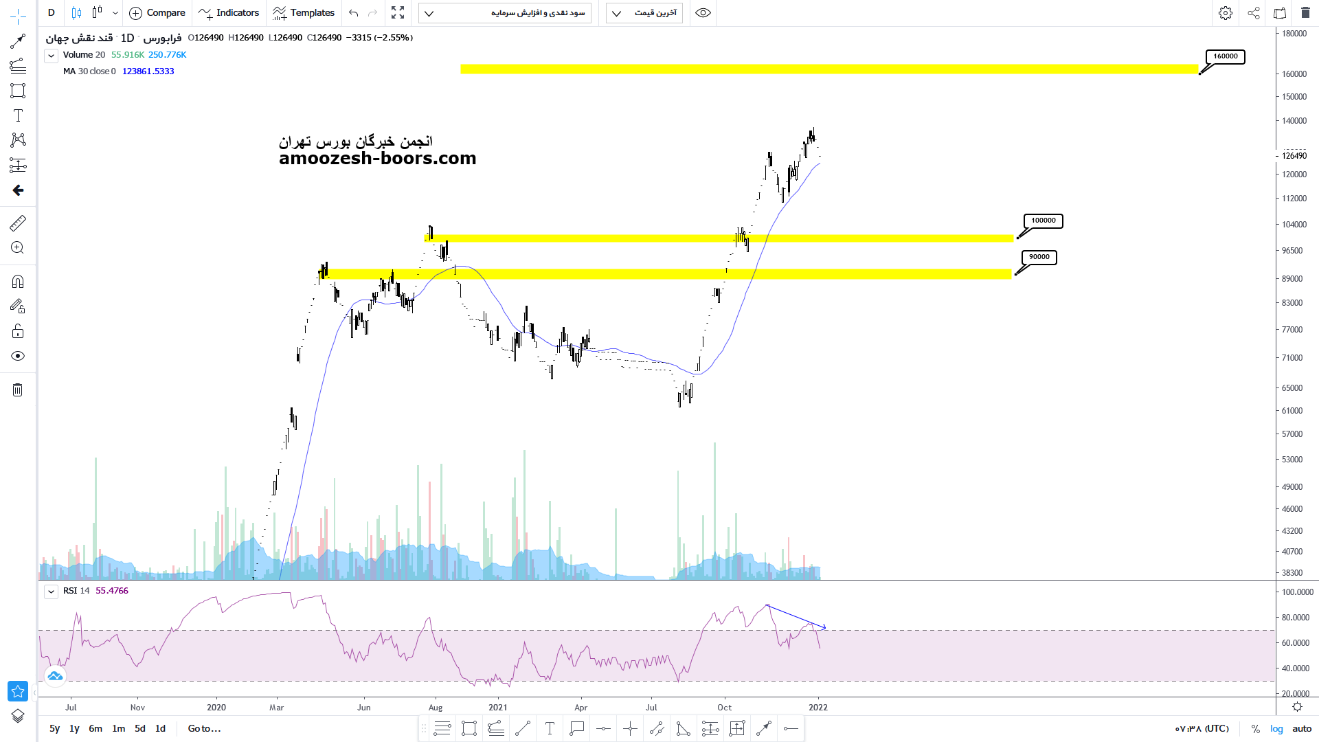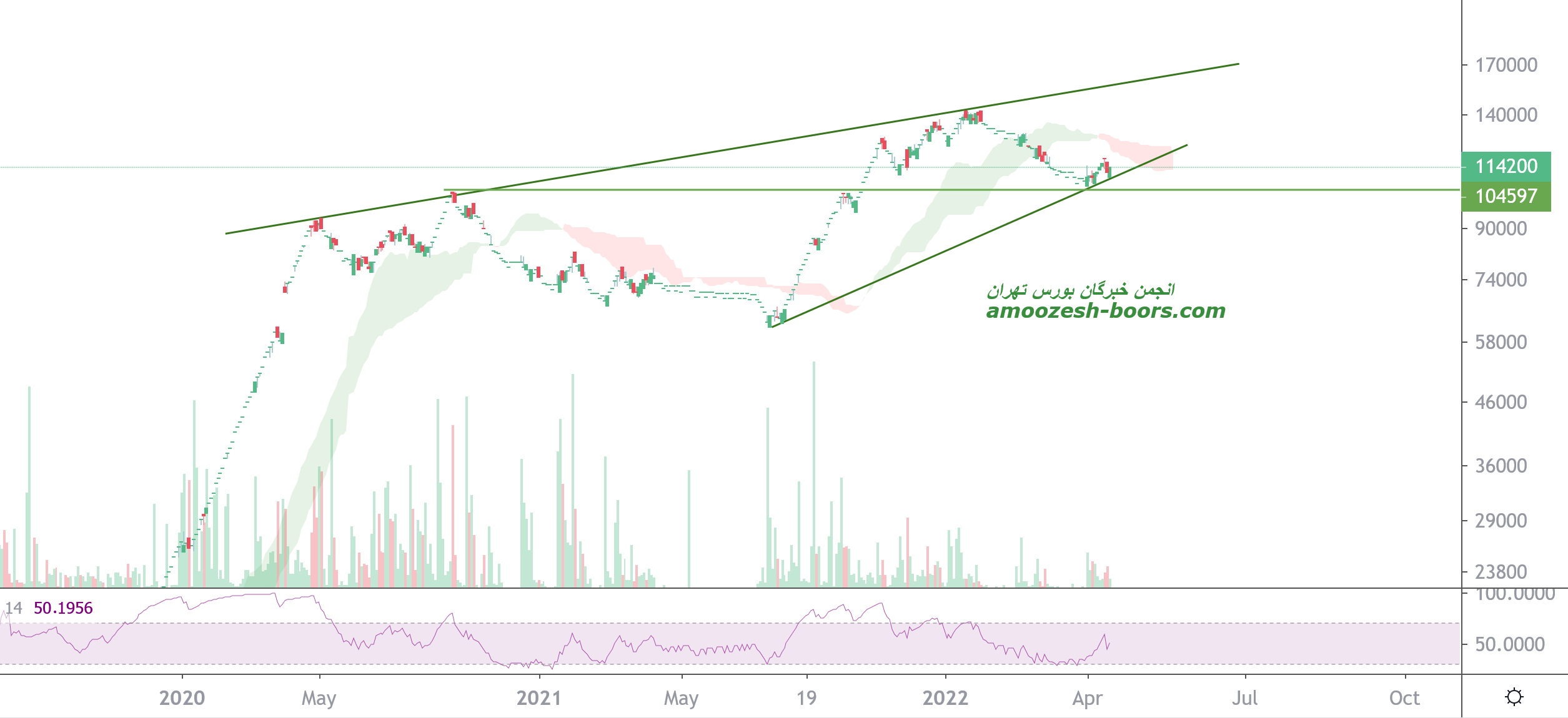 قیمت نماد در حال حاضر کف خط حمایت داینامیک صعودی است و در صورت افزایش تقاضا و صعود سهم مقاومت سهم 160000 ریال در نظر گرفته خواهد شد و در صورت شکسته شدن حمایت سهم 102000 ریال در نظر گرفته خواهد شد.