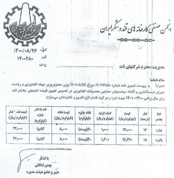 باید در نظر داشت چغندر ماده اولیه صنعت قند و شکر میباشد و هرگونه تغییر نرخ درین محصول مستقیما روی سودسازی شرکت های قند و شکر که برای تولیدات خود چغندر خریداری میکنند تاثیر گذار هست . قنیشا درین زمینه یک افشای اطلاعات داشته است. شرکت علاوه بر بهاء چغندر می بایست به ازای هر کیلوگرم چغندر خریداری مقدار 2 کیلوگرم شکر با نرخ 22.000 ریال و مقدار 20 کیلوگرم تفاله با نرخ 8.000 ریال تحویل گردد . نرخ فروش شکر مصوب شده در حال حاضر 132.000 ریال می باشد . نرخ شکر با توجه به قیمت خرید چغندر در سال جدید 180.000 ریال عنوان گردیده است.