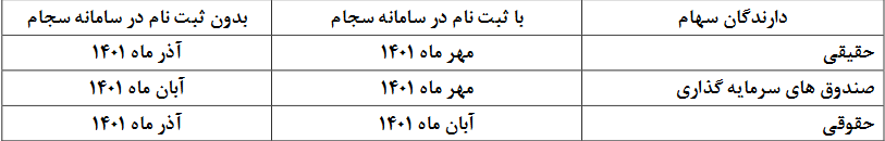 سود تقسیمی مصوب مجمع با همکاری شرکت سپرده گذاری مرکزی اوراق بهادار و تسویه وجوه ( سهامی عام ) از طریق سامانه جامع اطلاعات مشتریان (سجام ) به سهامداران پرداخت میگردد . لذا سهامداران محترمی که تا کنون ثبت نام خود در سامانه سجام را نهایی ننموده اند ضروری است به منظور دریافت سود سهام خود، در اسرع وقت نسبت به ثبت نام یا تکمیل مشخصات خود در سامانه سجام اقدام نمایند . همچنین برنامه زمانبندی پرداخت سود سهامداران محترم شرکت قند هکمتان (سهامی عام) برای دوره ۶ ماهه منتهی به ۱۴۰۰/۱۲/۲۹ بر اساس جدول زمانبندی ذیل اعلام میگردد :