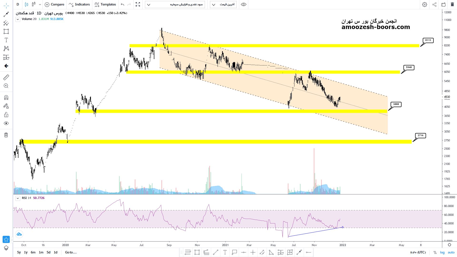 قیمت نماد قهکمت پس از اصلاح درون کانال زولی با نزدیک شدن به محدوده حمایت کلاسیکی 380 واکنش مثبتی را از خود نشان داد، با توجه به واگرایی صعودی اندیکاتور، مقاومت پیش روی قیمت محدوده 500 تومان یعنی محدوده سقف کانال و در صورت شکست میتواند تا مقاومت کلاسیک 600 تومان نیز صعودی داشته باشد