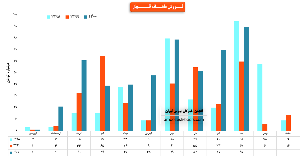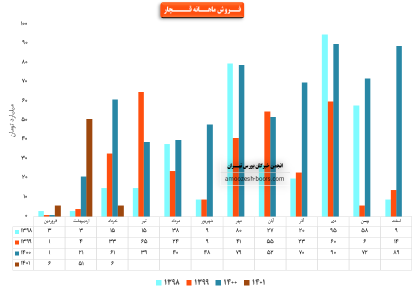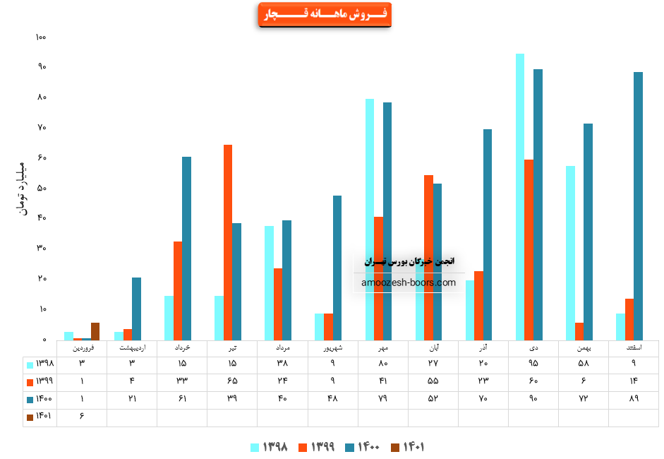 نماد قچار در فروردین ماه حدود ۹۰۰ تن از محصولات خود را به فروش رساند که این میزان در مقایسه با فروش اسفند ماه حدود 92% کاهش پیدا کرده که با توجه به فصلی بودن فعالیت سهم قچار امری طبیعی میباشد.