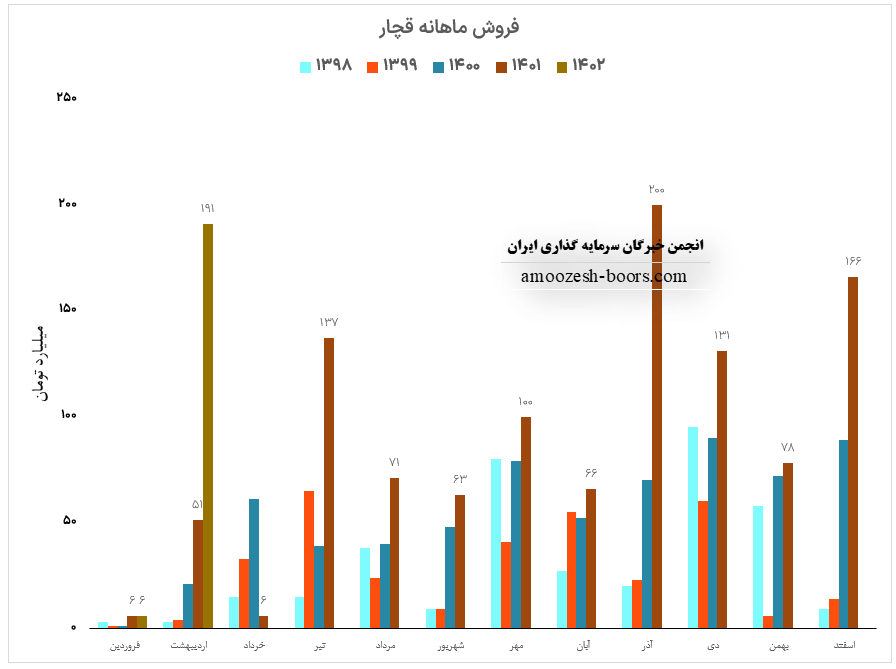 فروش ماهانه نماد قچار در سومین ماه از سال مالی به 149 میلیارد تومان رسیده است، که نسبت به ماه گذشته افت 22 درصدی را نشان میدهد، فروش ماهانه سهم قچار در مقایسه با متوسط ماهانه 51% و نسبت به مدت مشابه 2383% افزایش داشته است.