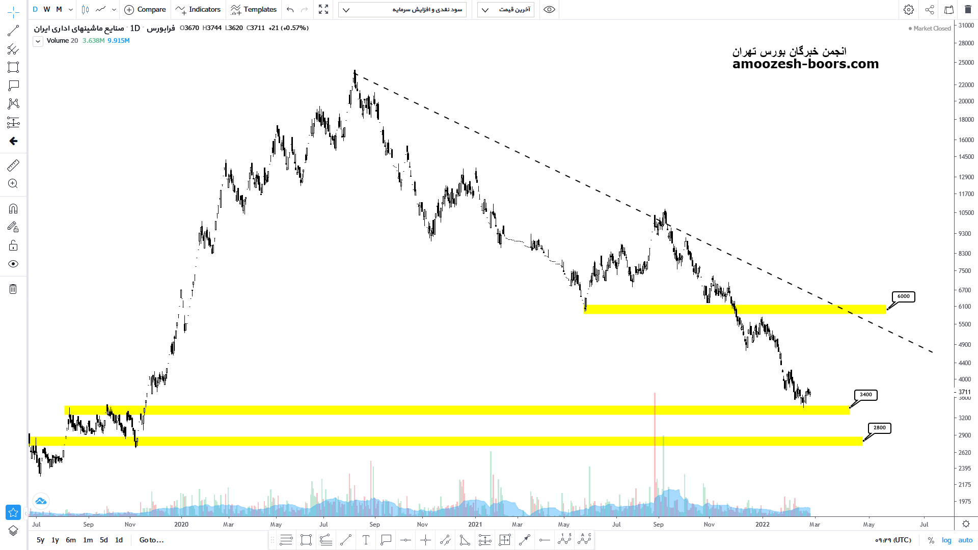 قیمت پس از شکست محدوده حمایتی ۶۲۰ تومان و انجام پولبک به ان ریزش خود را ادامه داده و اکنون به محدوده حمایتی ۳۴۰ تومان رسیده است در صورت حمایت از این محدوده می توانند رشد خود را تا محدوده مقاومتی خط روند نزولی خود جهت تایید خط روند ادامه دهد اما در صورت شکست این محدوده قیمت میتواند تا محدوده۲۸۰ تومان نیز نزول خود را ادامه دهد