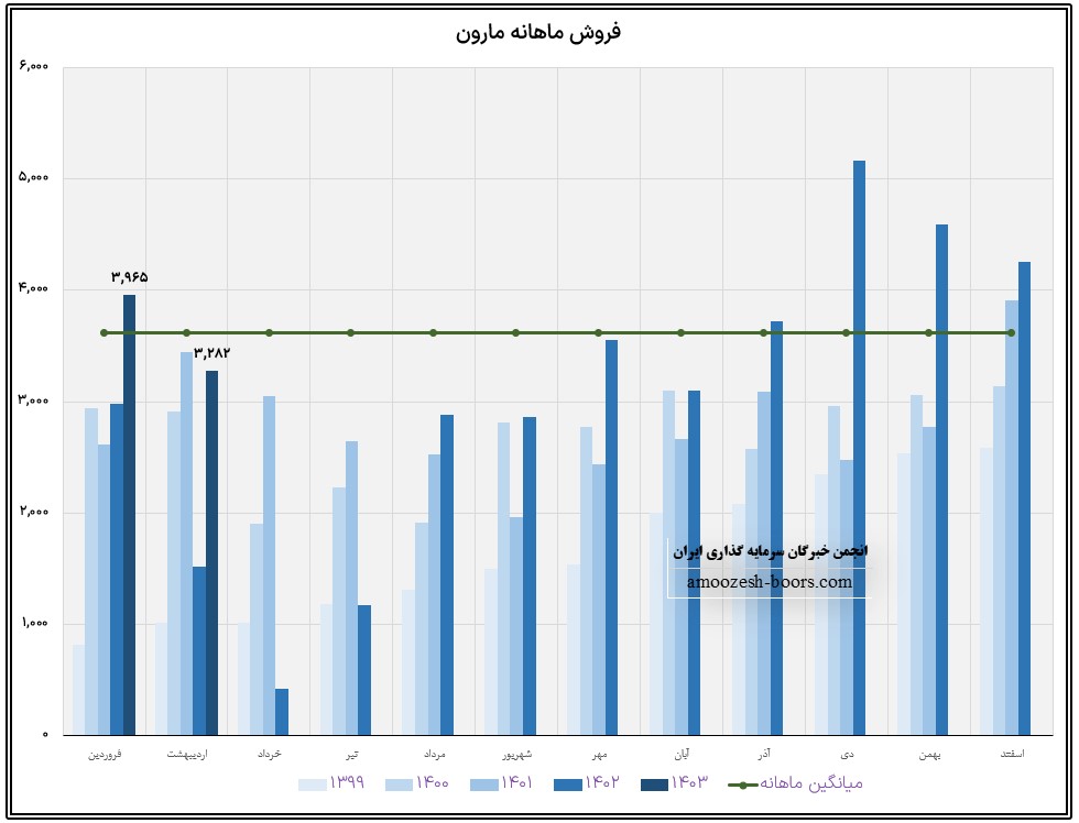 مارون در بهمن ماه توانست بالغ بر 115000 تن از محصولات خود را به فروش برساند که این میزان در مقایسه با فروش ماه گذشته حدود 26% افت پیدا کرده است.