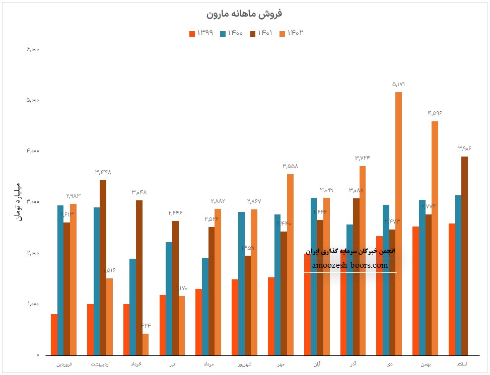 نماد مارون در اسفند ماه از طریق فروش داخلی به فروش 4255 میلیارد تومانی دست یافت، که 25% از این رقم را از طریق صادرات و مابقی را از طریق فروش داخلی به فروش رسانده است.