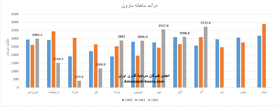 فروش آذر ماه سال 1402 سهم مارون 3723.9 میلیارد تومان گزارش شده است که 75% از این رقم از طریق فروش داخلی و مابقی از طریق صادرات تامین گردیده است، تغییرات درآمدی مارون به شرح زیر میباشد: